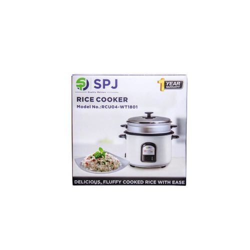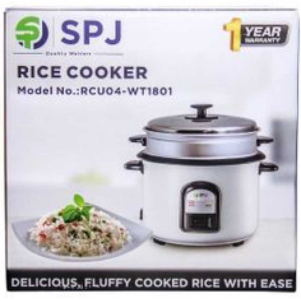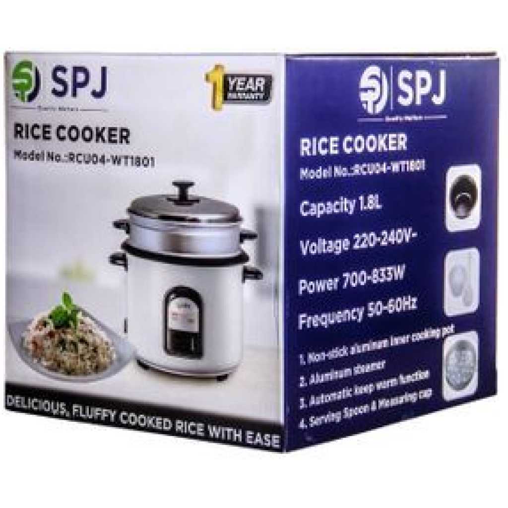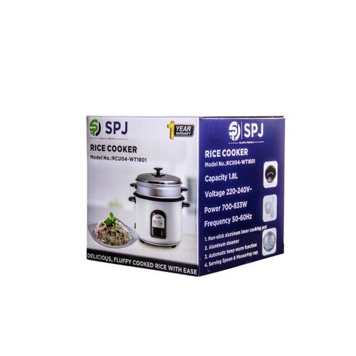 Key Features: SPJ 1.8 Liters Rice Cooker With Steamer – White. RCU04-WT1801 Capacity: 1.8L Voltage: 220-240V Power 700-833W Frequency: 50/60HZ Non – Stick aluminium inner cooking pot Aluminium Steamer Automatic keep warm function Serving spoon& Measuring Cup
