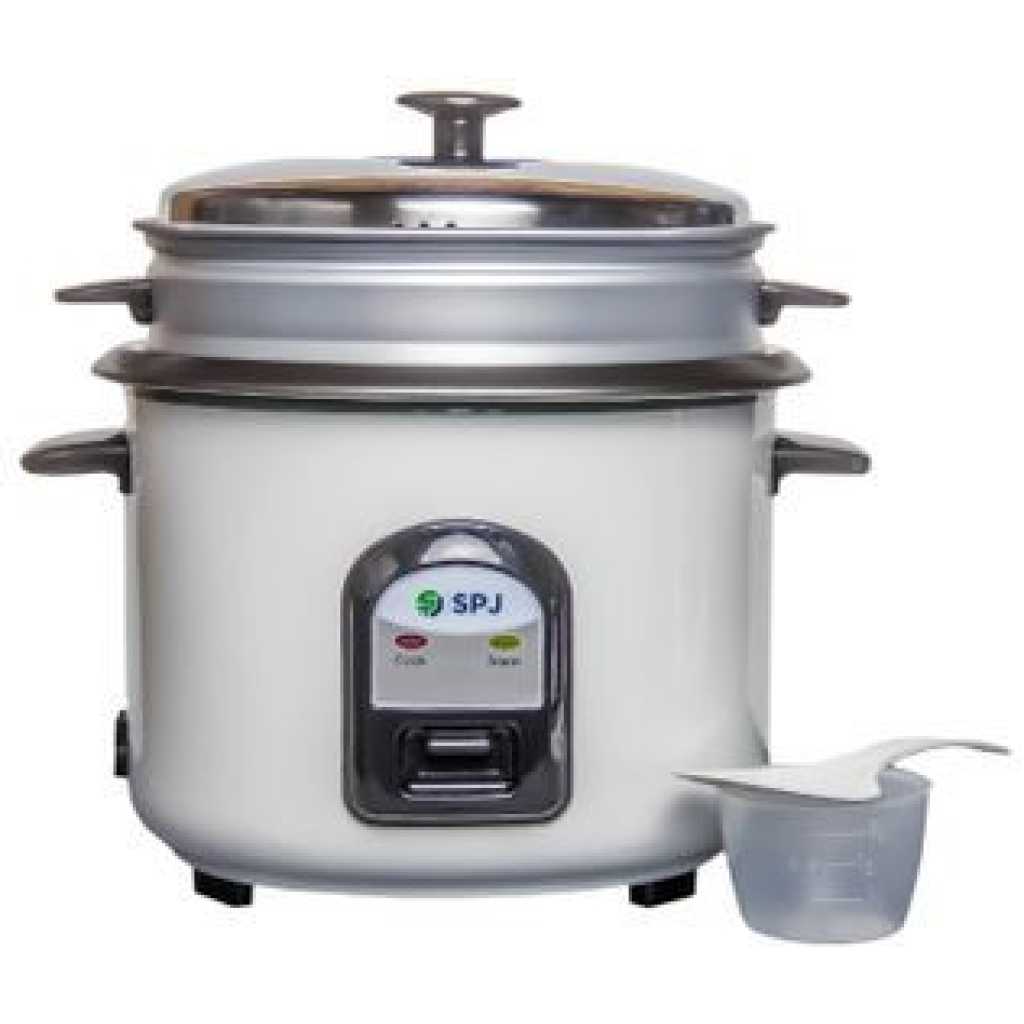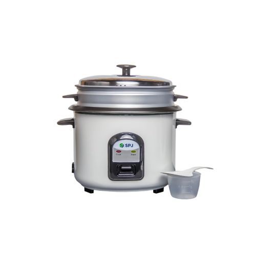 SPJ 1.8 Liters Rice Cooker With Steamer – White. This Rice Cooker comes with a capacity of 1.8L which is more than sufficient to cook your daily meals. The steam basket allows you to steam a variety of meats and vegetables, cooking them in a healthy and efficient manner. The keep-warm function ensures your food is kept nice and warm once it has been cooked until its time for your meal. The locking mechanism in this appliance prevents any overflow and makes it a safe appliance to use.