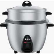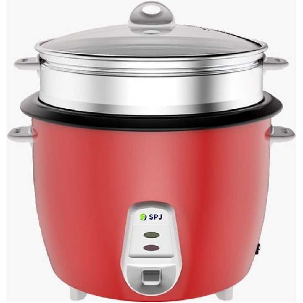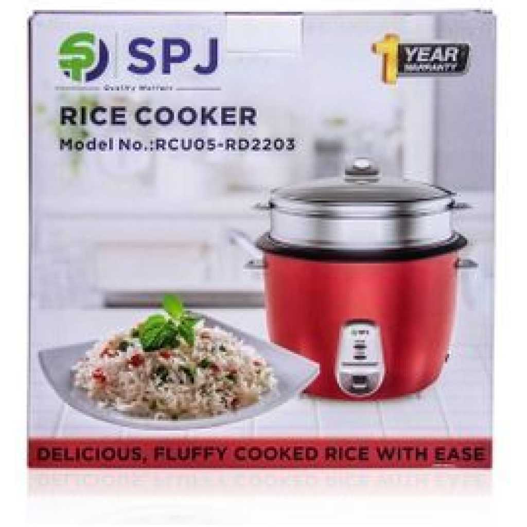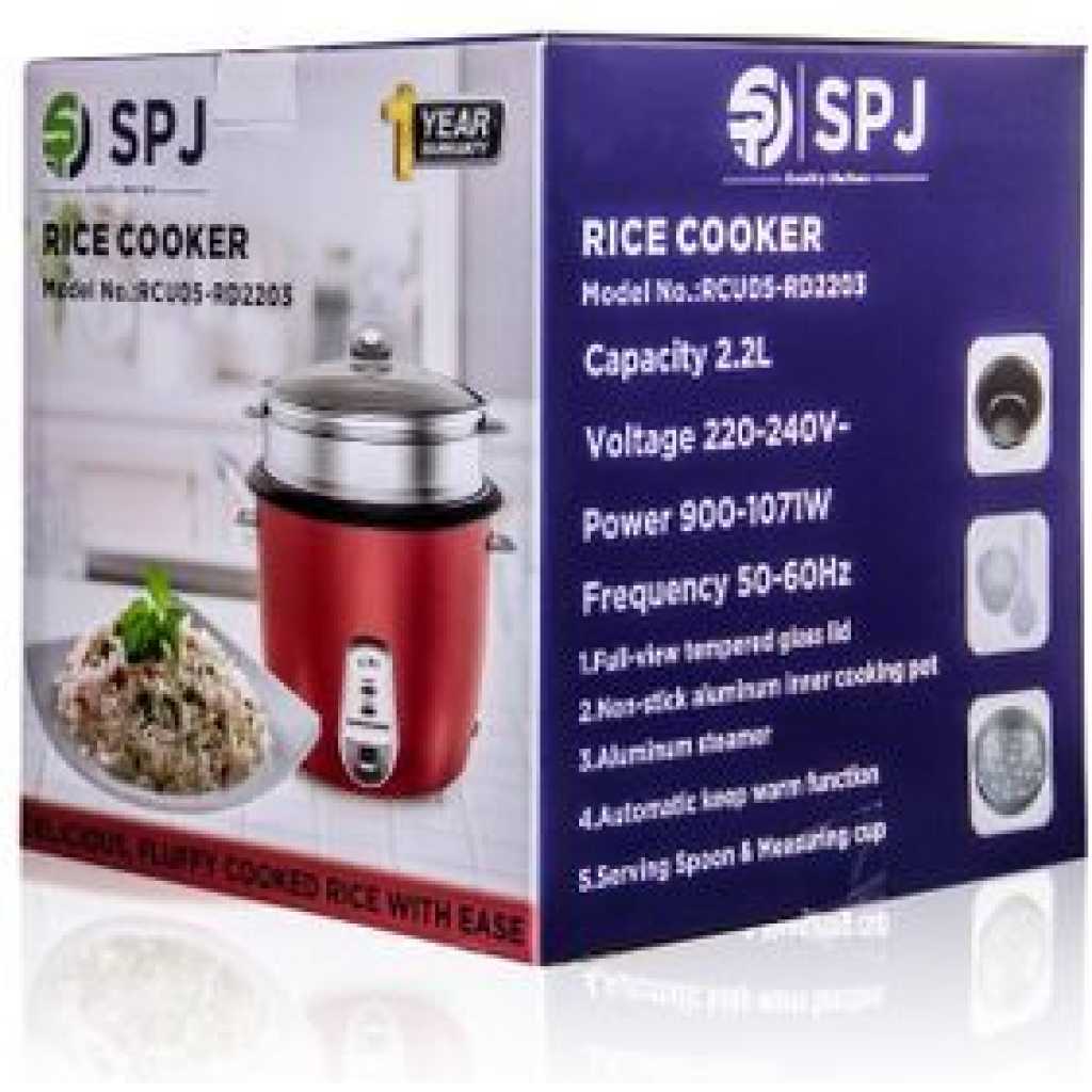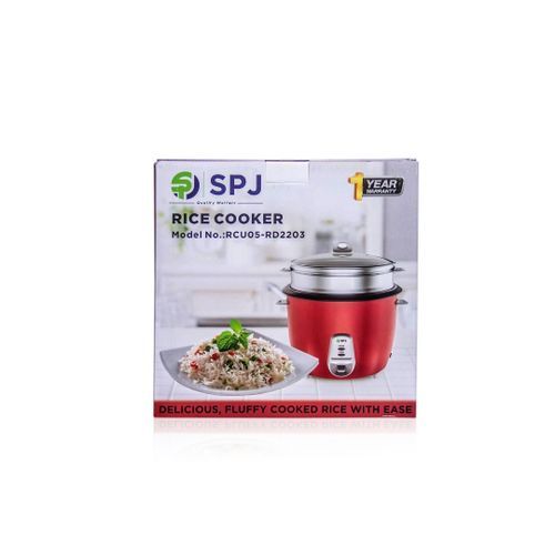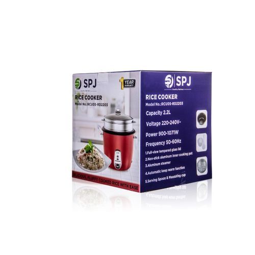 SPJ 2.2 Liters Rice Cooker With Steamer – Red. This Rice Cooker comes with a capacity of 2.2L which is more than sufficient to cook your daily meals. The steam basket allows you to steam a variety of meats and vegetables, cooking them in a healthy and efficient manner. The keep-warm function ensures your food is kept nice and warm once it has been cooked until its time for your meal. The locking mechanism in this appliance prevents any overflow and makes it a safe appliance to use. Key Features: SPJ 2.2 Liters Rice Cooker With Steamer – Red. RCU05- RD2203 Capacity: 2.2L Voltage: 220-240V Power 900-1071W Frequency: 50/60HZ Fukk -View tempered glass lid Non – Stick aluminium inner cooking pot Aluminium Steamer Automatic keep warm function Serving spoon& Measuring Cup