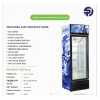 Key Features: SPJ 400-Litres Single Display Cooler SCCSTS-400C016; Vertical Display Chiller, Single Door Showcase Display Refrigerator Capacity (Litre) 400LTR Beverage Display Cooler Yes SPJ Warranty Type: Showcase Beverage Chiller Mechanical Temperature Control With Adjustable Thermostat Auto Defrost System Integrated Arc Door (One Piece), Fashionable Appearance Inner Light For Bright Showing Effect Of Vertical Light To Have A Better Lighting Double Layer Door Glass Design Environment-Friendly Technology Convenience Wheels Design For Easy Moving With Self-Evaporate Water Disposal Pan Low Voltage Start With Internal And Bottom Fans To Provide Higher Cooling Efficiency With Hot Air Flow To Avoid Water Condensation