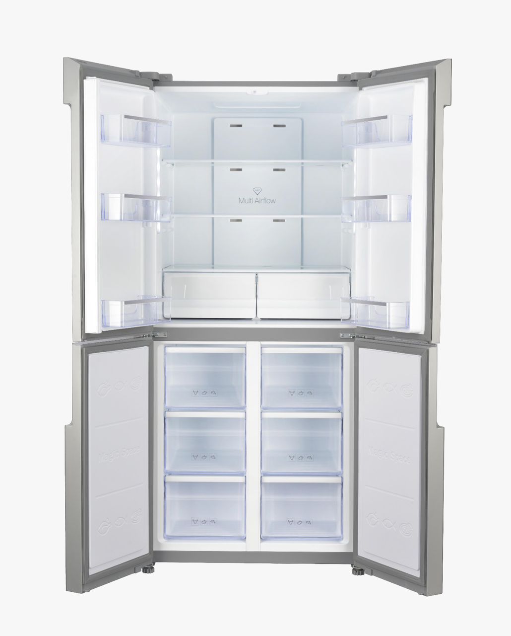 SPJ 559L 4 Door Elegant Glass Finish Refrigerator | RFG-4BLU559C. Keep your perishables fresh and your kitchen classy with the SPJ 559 Pure Flat Stainless French Door Fridge. Driven by an inverter compressor motor, the fridge operates efficiently and quietly. This impressive American style multi door fridge freezer is abundant in space, as well as style and functionality. With its 4 large doors it offers you complete flexibility, no matter the size of your family. Controlled by the integrated LED display with Touch Electronic Control, The Triple Zone Cooling with My Fresh Choice, super cool and super freeze functions and Multi-Function Pantry allow you to tailor the way you chill or freeze your food, depending on your needs. Choose how you chill your food. With a dedicated pantry drawer, this is an ideal area to store all your deli foods. Inverter technology for energy savings and a longer-lasting appliance. The refrigerator comes with a total no-frost multi-air flow system which will keep your food fresh. The salad crisper will ensure your greens stay fresh for longer. The Eco energy function and holiday function will make sure that your electricity bills stay small. The fridge comes with interior light and the freezer box has a twist-style icemaker. Specifications 559 Litres Model RFG-4BLU559C No Frost Black Glass doors Four doors Bottom freezer Adjustable Glass Shelves LED Display Ice And Egg Tray Inside Light Crisper Drawer Powerful Compressor Low Noise Design Electronic Temperature Control