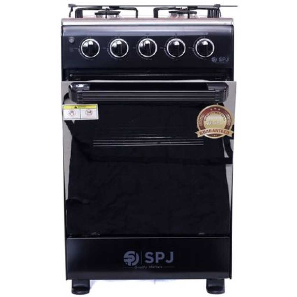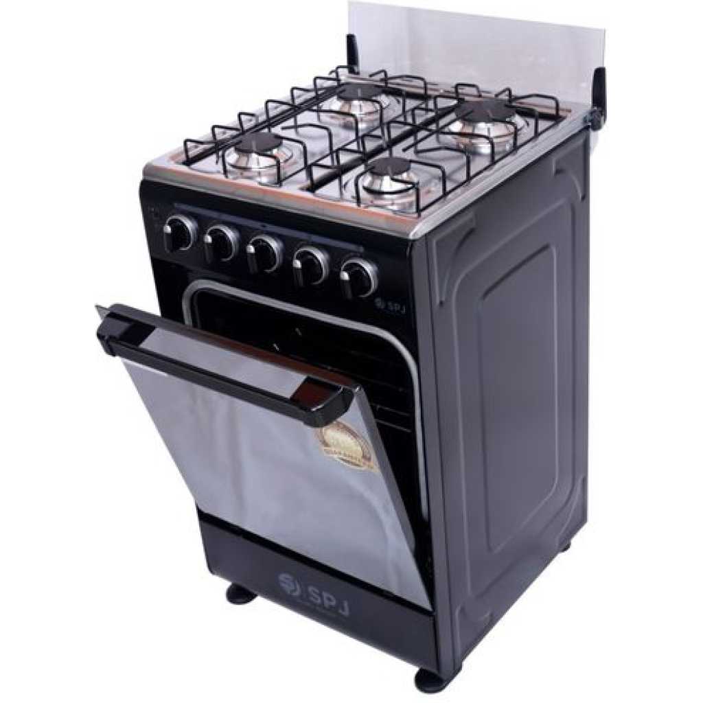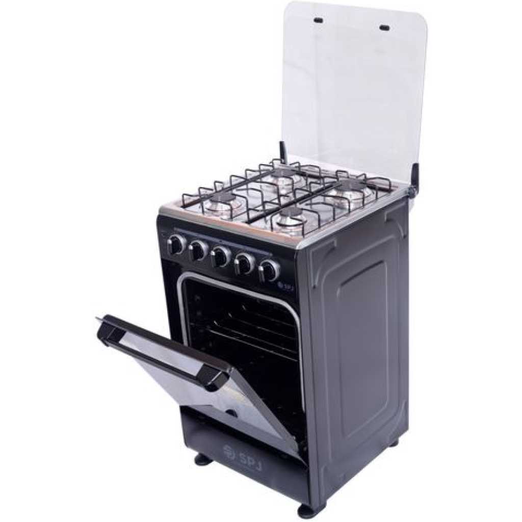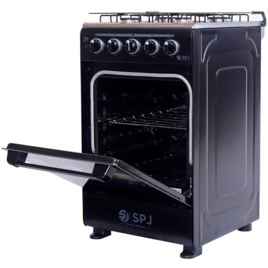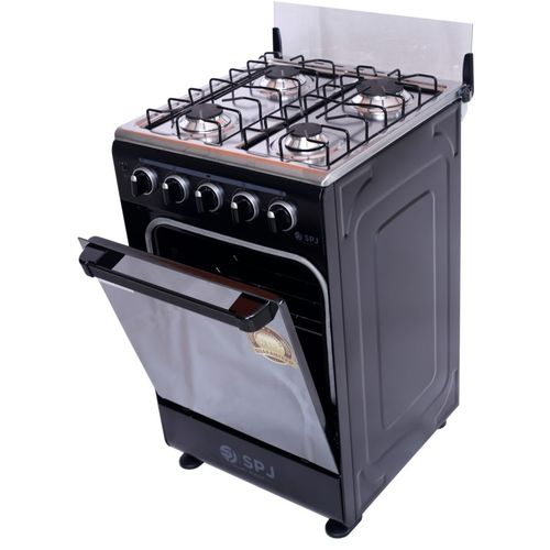 Key Features: SPJ Full Gas Cooker 50x50cm, 4-Gas Burners, Oven and Grill – Black. Manual Ignition 4 gas burners 60L Gas oven Glass Top Double Glass Oven Door Special high-density insulation- for faster & quicker baking Baking Rack Width 50cm x Depth 50cm