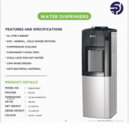 Key Features: Dispenser type: Standing Compressor Cooling Unique water drop shape Child lock for hot water Low Noise Design 16L Cabinet Dispenser cooling type: Cold,Hot & Normal Stainless Steel Water Tank Power Protection Fuse Warranty: 2 Years