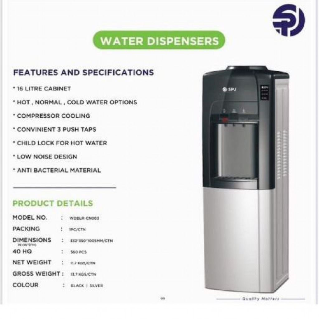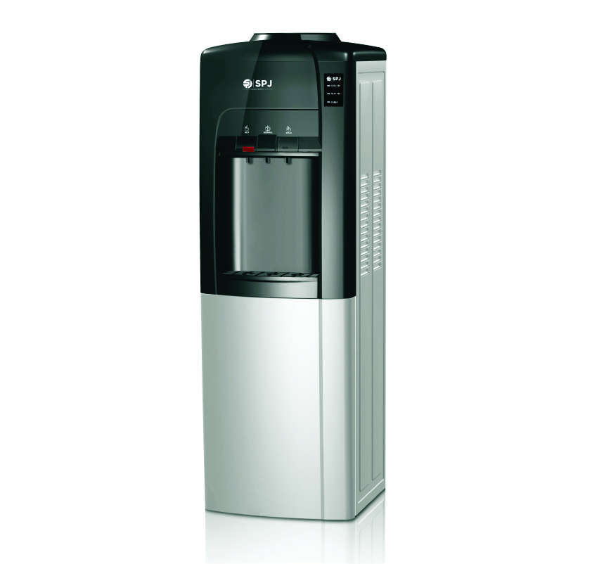 SPJ Water Dispenser WDBLR-CN003, Hot, Normal & Cold 3 Taps Free Standing – Grey. Quench your thirst with a cool glass of water provided by the Orvica Water Dispenser with a storage Cabinet. This powerful, free-standing water dispenser features THREE faucets for dispensing water. All you need to do is hold down the desired lever, and out comes refreshing water instantly. This device can accommodate all types of commercially available large water bottles. Onboard LED lights provide you with information about the dispenser in a glance. What’s more? This incredible water dispenser also comes with a functional storage cabinet at its bottom, which can hold your lunch boxes, takeaways, smaller bottles of water, and more. The fridge is powerful enough to cool all your stored contents. The water dispenser and the cabinet are made using high quality materials. This fantastic Black and Grey device, with its incredible features, makes a perfect addition to your homes and offices. Key Features: SPJ Water Dispenser. 3 Faucet provides Hot, Normal & Cold Water Hot Water Child Safety Lock With storage Cabinet to keep your food safe and preserved This daily home utility appliance comes with a compact refrigerator to store food and beverages The anti-bacterial inner tank ensures safe drinking water Supports fast and easy cleaning efficiently Premium quality construction ensures durability Power 610W Hot Temperature 85-90C Cold Temperature 4-12C Water Dispenser with cabinet Heating Power/Refrigeration Power 500/110W Height 97 Cm Voltage 220-240V