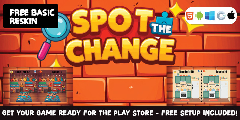 Spot The Change - Construct 3 Game HTML5. Test your sharp eyes and spot the changes in fun and vibrant indoor scenes. Find every difference before time runs out!