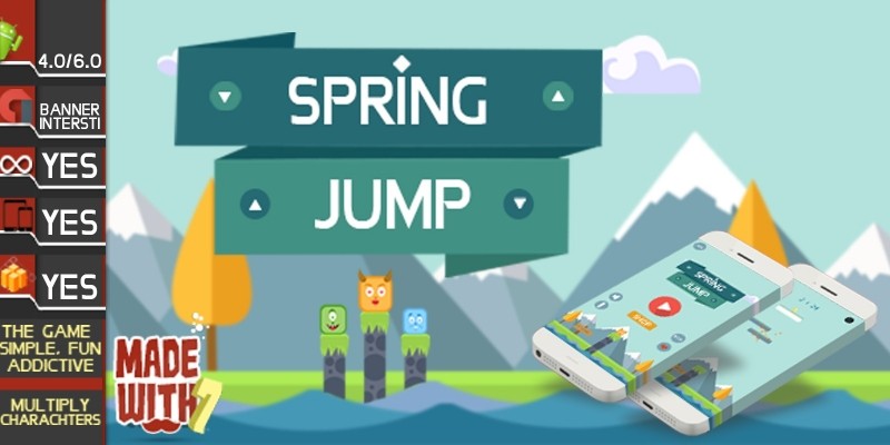 Spring Jump - Buildbox Game Template. This file includes : AdMob ( Banner + Interstitial ) + Buildbox file + All Assets ( HD Images + Sounds ) .