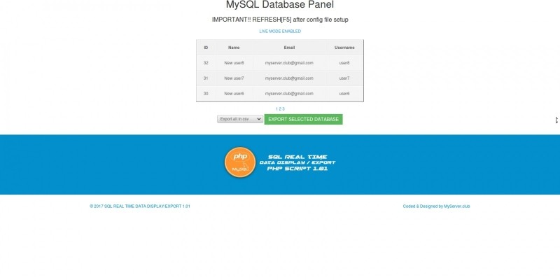 SQL Real time Data Display And Export Script. Display data from your SQL database in real time. Includes 3 export options. The script is easy to setup through your browser.
