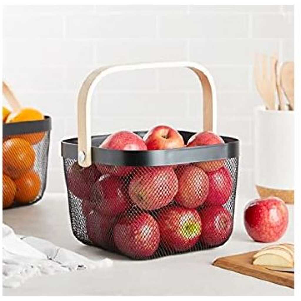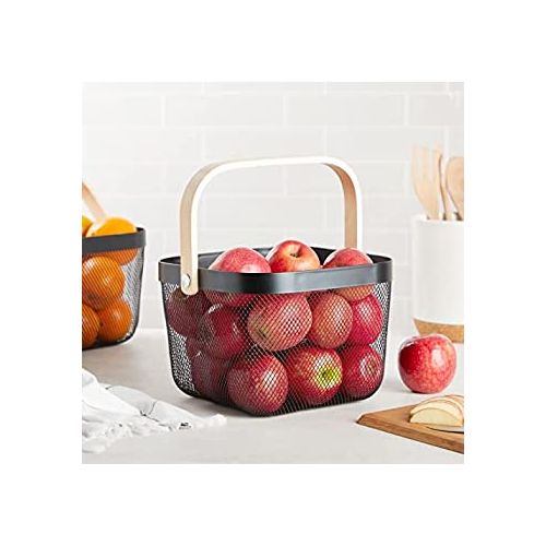 Key Features: Square Metal Mesh Fruit Shopping Wooden Handle Storage Basket. Small Basket With Handle: These mesh fruit holders for kitchen countertops are a great and decorative way to organize items within your household or produce, bread, vegetables, and snacks. Versatile: Use each wire mesh basket for its own use; useful as a way to store fruit, organize shelves, and can even be taken out for a picnic. Quality Made: Durable and built to last, each mesh basket is made with metal wire and includes a wooden handle, ensuring your product is safe while it’s stored Dimensions: Each mesh fruit basket is 9.5 x 9.5 x 7 inches, 12 inches with the handle; perfect for holding fruits and other household items Comes With: You will receive 1 black pantry basket, for multiple needs throughout the house.