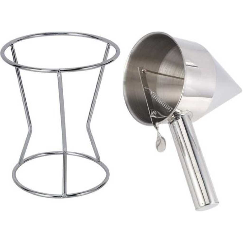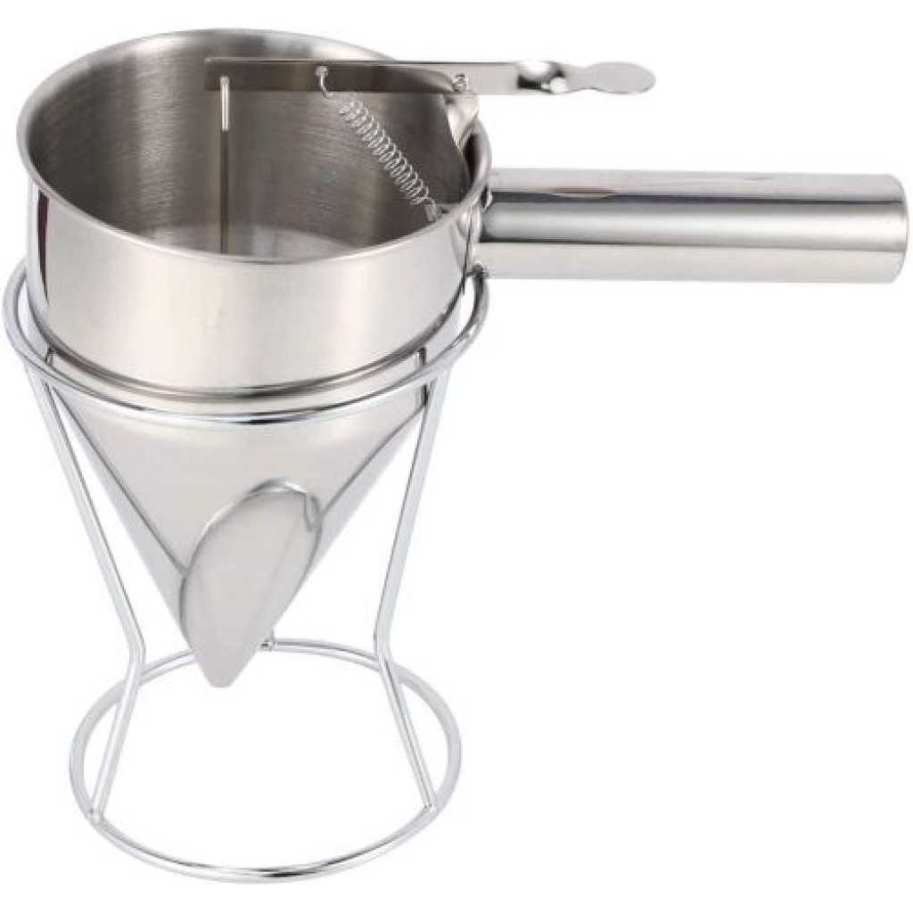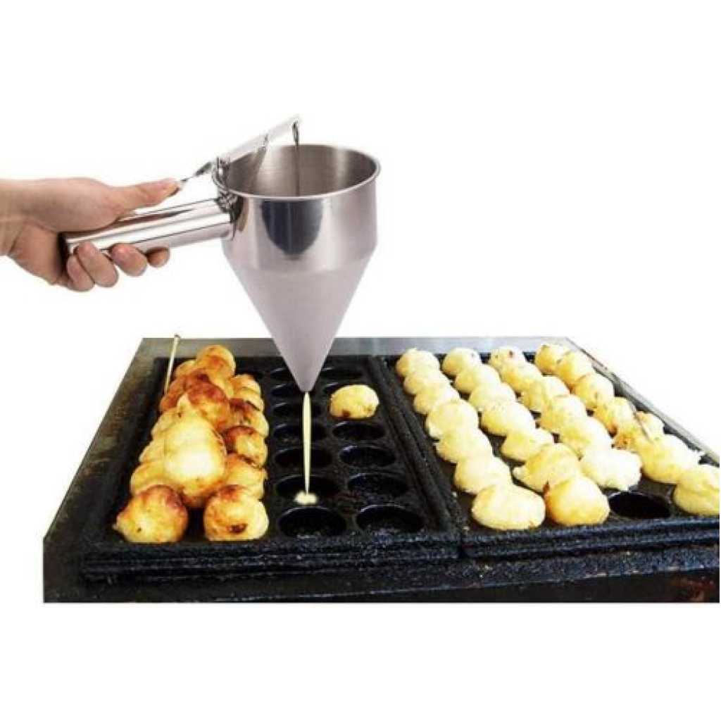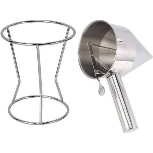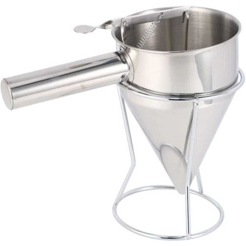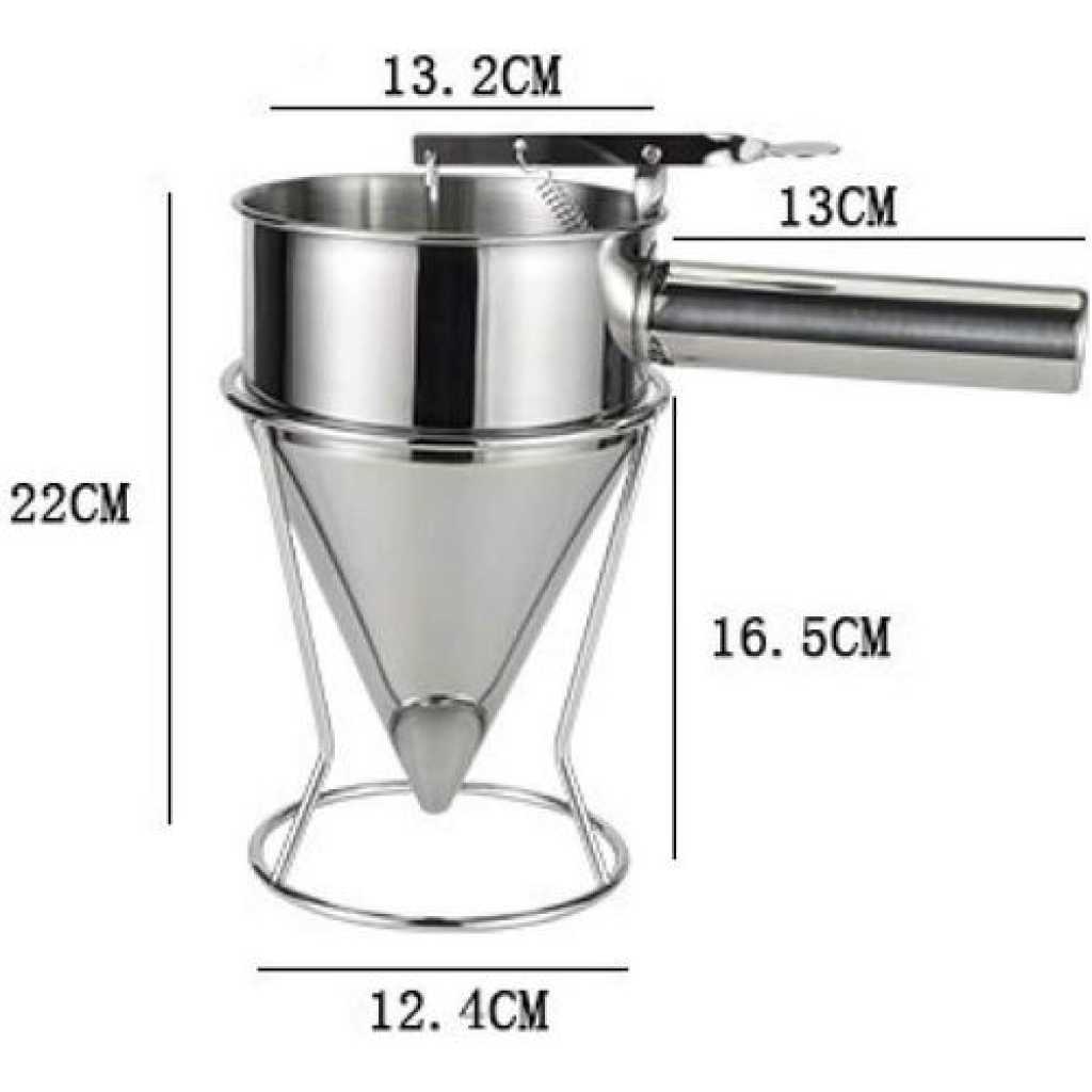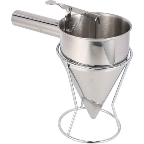 1. Great gift for anyone who loves pancakes. 2. Make perfect pancakes without the mess of bowls and spoons. Dispenses dough precisely for even pancakes every time. Also great for making crepes, waffles and cupcakes. 3. When you use it, please put it on a plate, the item will make a small drop after your pancake is made. 4. Equipped with an easy to control, spring-loaded handle that opens and closes the dispenser nozzle, you and your family will always be able to prepare perfectly portioned and consistent breakfast foods and desserts. 5. This gourmet chef tool is not only beautiful, it is made of sturdy, durable stainless steel. This dough pourer is an attractive addition to your kitchen that will last for years. Note: 1. The color of the item may be slightly different from the pictures shown due to the light and screen setting difference. 2. Due to manual measurement, there may be 1-2 cm deviation. Specification: Size: approx. 22 x 14 cm. Material: stainless steel. Applications: household, kitchen, hotel Colour: silver. Package includes: 1 x Pancake Dough Dispenser 1 x Frame Package includes: 1 x Pancake Dough Dispenser 1 x Frame Color: silver Material: steel Size: Upper diameter of the funnel: 13.5cm Height: 19.5cm Handle length: 12cm Package Content: 1 * steel funnel 1 * stents Key Features: Suitable for hotel cooking, cake, bakery and home cooking. Frosted surface treatment in the funnel interior wall, easy to clean, effectively prevent scratches. Tool to make Octopus balls easily. The funnel mud out of the mouth is flat to near the mouth of the white plastic particles to prevent leakage under the mud. intimate design,Equipped with storage shelves, easy to store.