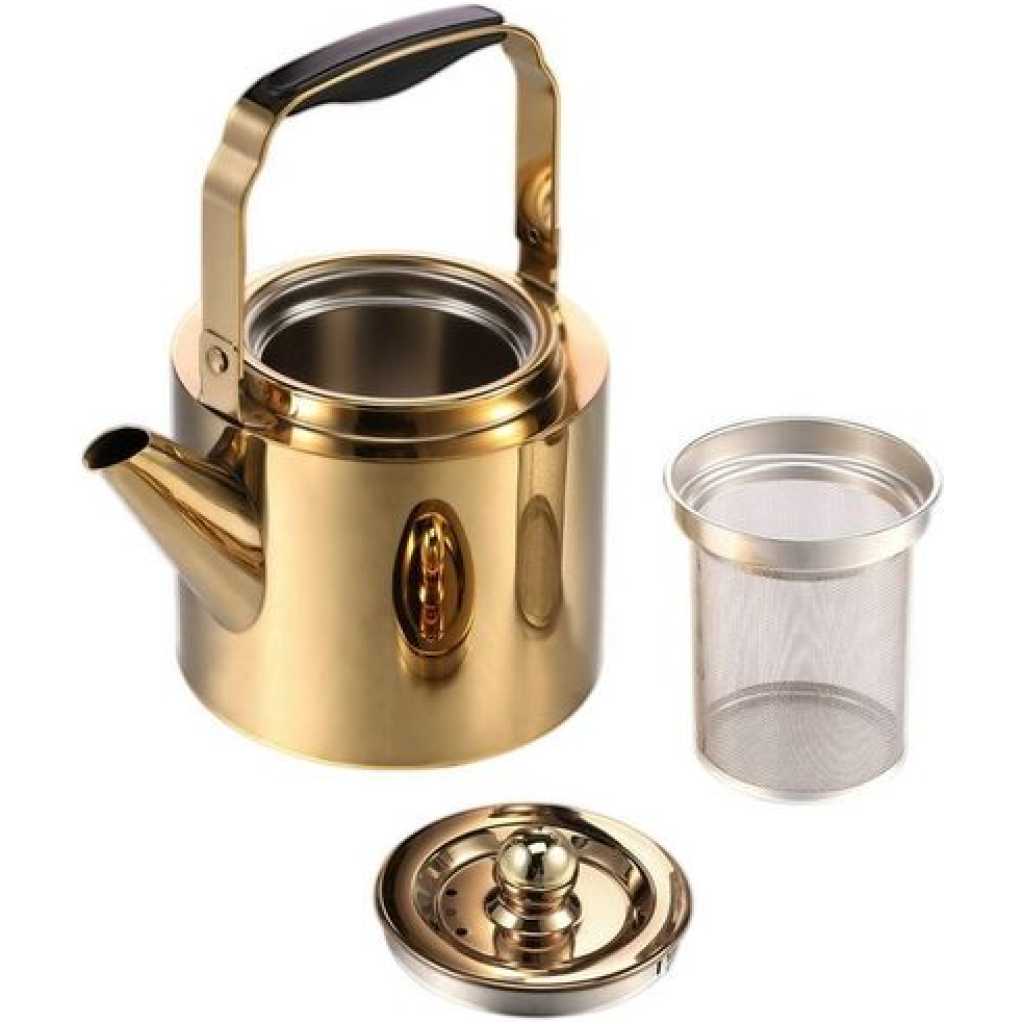 Product details Parts List: 1 x Tea Pot 1 x Tea Infuser Highlight description: Premium Material: Crafted from quality stainless steel , this teapot offers exceptional durability . Its versatile design allows use on induction cookers , gas stoves , electric heaters , ceramic hobs , and even charcoal stoves , meeting all your brewing needs Functional Spout Design: The innovative eagle style spout combines ergonomic comfort with practical functionality . Its unique shape ensures smooth pouring without drips while providing dust protection , bringing convenience to your daily tea time Generous Capacity: With a 1 .8L capacity , this teapot comfortably serves 3 to 6 people . Perfect for both personal use and entertaining guests , it meets all your serving requirements in one brew Removable Tea Infuser: The detachable infuser features a fine mesh filter that effectively strains tea leaves while allowing optimal water circulation for full flavor extraction Upgraded User Experience: The ergonomic handle provides a secure , non slip grip with heat resistant properties for comfortable handling . The energy concentrating base ensures fast , even heating to boil water quickly and save your valuable time Detailed description: Description Made of stainless steel , sturdy and enduring, the shape is not only ergonomic , but also has a capacity of 1 .8L , which can meet the drinking needs of 3 to 6 people . Key Feature Nonslip Design:The handle of this teapot is designed with a non slip grip , which is comfortable to hold , insulated and anti scalding , making it more comfortable to lift and put it away with less effort . Specification Product name: Stainless Steel Tea Pot Material: stainless steel Dimensions: Total height of pot 14.5cm(5.71 inch) Body height 11cm(4.33 inch) Handle height 11cm(4.33 inch) Base diameter 13.5cm (5.31 inch) Caliber 10.5cm(3.94 inch) Color(optional):Silver, Gold Notes: 1.There may be slight differences between the picture and the actual color of the commodity. We will try our best to show you the exact color. 2.Please allow slight dimension difference due to manual measurement. Premium Material: Crafted from quality stainless steel , this teapot offers exceptional durability . Its versatile design allows use on induction cookers , gas stoves , electric heaters , ceramic hobs , and even charcoal stoves , meeting all your brewing needs Functional Spout Design: The innovative eagle style spout combines ergonomic comfort with practical functionality . Its unique shape ensures smooth pouring without drips while providing dust protection , bringing convenience to your daily tea time Generous Capacity: With a 1 .8L capacity , this teapot comfortably serves 3 to 6 people . Perfect for both personal use and entertaining guests , it meets all your serving requirements in one brew Removable Tea Infuser: The detachable infuser features a fine mesh filter that effectively strains tea leaves while allowing optimal water circulation for full flavor extraction Upgraded User Experience: The ergonomic handle provides a secure , non slip grip with heat resistant properties for comfortable handling . The energy concentrating base ensures fast , even heating to boil water quickly and save your valuable time