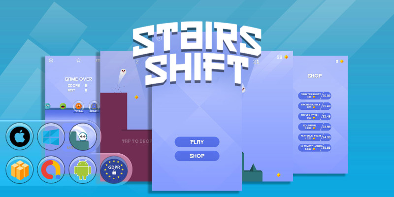 Stair Shift - Buildbox Template. Tap to fall with bouncing characters, descend the stairs, collect diamonds, and unlock multiple characters.