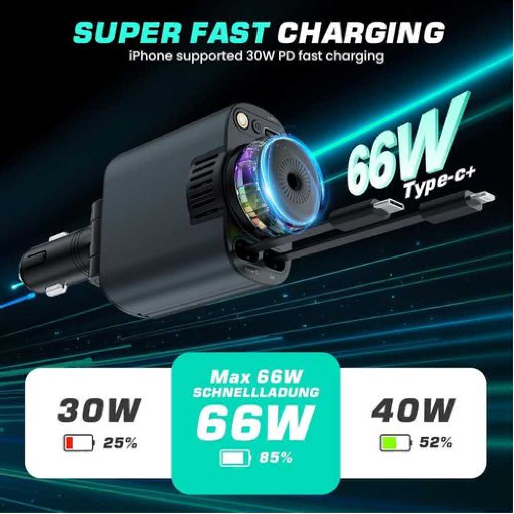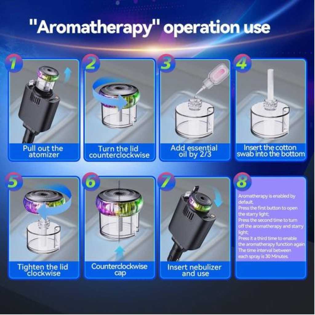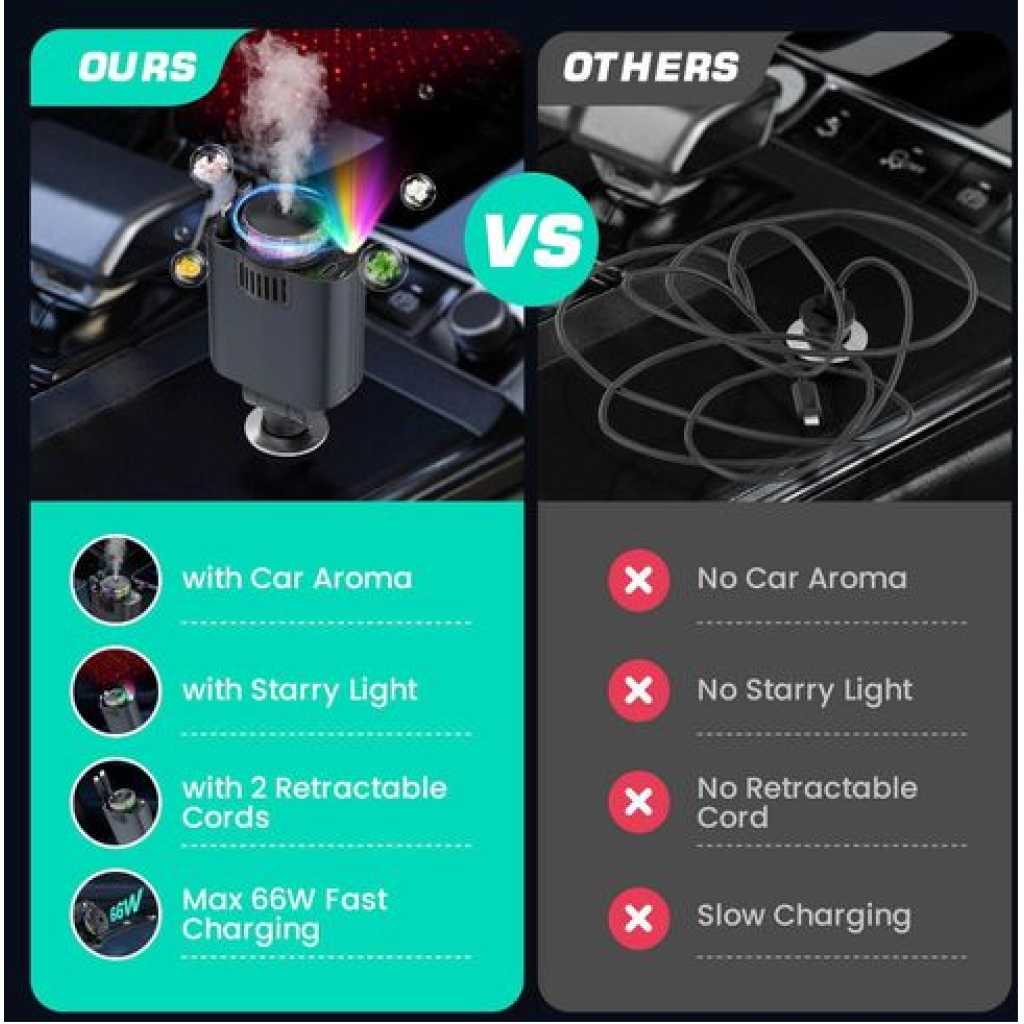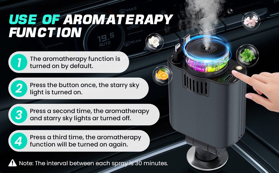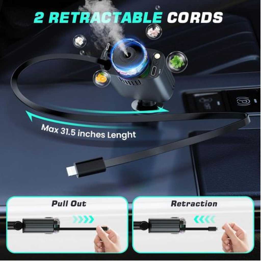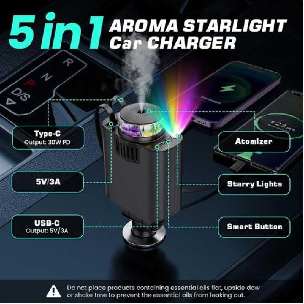 Product description [Packging] : Charging Machine x1, Perfunme in Bottle x3, Manual x1 and other accessories. [5-in-1 Retractable Car Charger]: The car charger not only equipped with 2 retractable cables (for Type-C and IOS) and two additional ports (USB-C and USB-A), but also with starry sky, car aromatherapy function. [Aromatherapy Experience]: The waterless diffusing technology directly converts your favorite choice of essential oils into a ‘nano mist’ without using heat or water. Enhance your vehicle journey with a scent experience. This is a natural, more convenient, and safer choice. [Starlight Experience]: This Starry Sky car charger not only charges your devices quickly but also projects a mesmerizing starry night sky onto your car’s interior, creating a captivating ambiance that enhances every drive. [ Suitable for Various Vehicle and Phone Models ] : Fast Charging Retractable Car Charger is compatible with iPhone 16/15/14/13/12 /11 series, Android Series and various devices such as tablets, Pads, notebooks, headphones, game consoles and 12V-24V vehicles. Key Features: [Packging] : Charging Machine x1, Perfunme in Bottle x3, Manual x1 and other accessories. [5-in-1 Retractable Car Charger]: The car charger not only equipped with 2 retractable cables (for Type-C and IOS) and two additional ports (USB-C and USB-A), but also with starry sky, car aromatherapy function. [Aromatherapy Experience]: The waterless diffusing technology directly converts your favorite choice of essential oils into a ‘nano mist’ without using heat or water. Enhance your vehicle journey with a scent experience. This is a natural, more convenient, and safer choice.