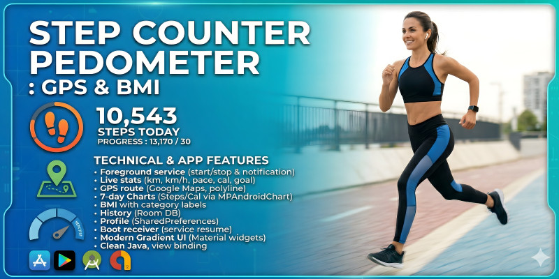Step Counter – Pedometer Android App Source Code. Android 7.0+ pedometer with foreground service, live stats, GPS route map, BMI calculator, 7‑day charts, and history (Room DB)