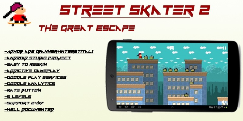 Street Skater 2 - Android Game Source Code. The Great Escape is a one click action game. With one click the Tony will jump over roofs of skyscrapers.
