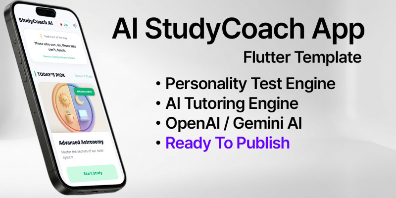 StudyCoach AI - Flutter AI Learning Assistant. Launch an AI-powered study app in minutes. Includes AI Tutor (Gemini/OpenAI), JSON content system, and AdMob monetization.