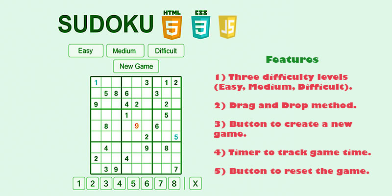 Sudoku JavaScript Game . SUDOKU game developed in HTML, CSS, and JavaScript. The game has three difficulty levels: Easy, Medium, and Hard.