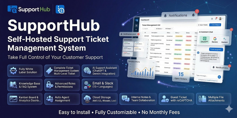SupportHub - AI Powered Support Ticket System. Full-featured help desk solution with AI responses, ticket tracking, knowledge base, multi-agent support, and email notifications.