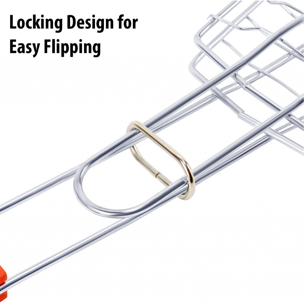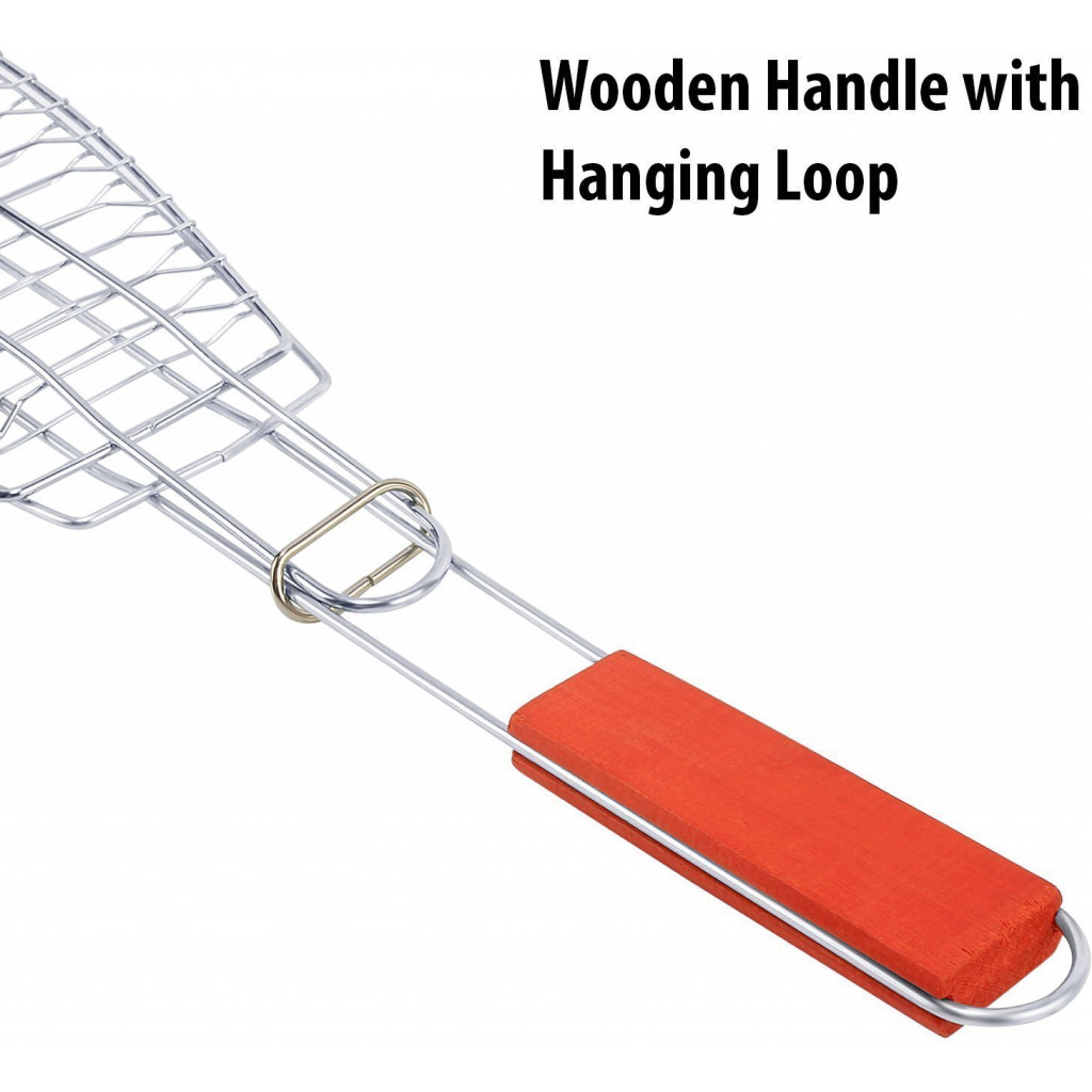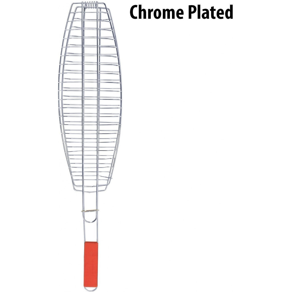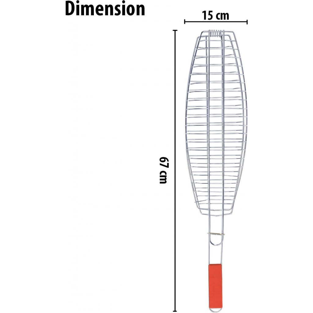 Grill Fish meats or veggies with this BBQ Grill Basket. Chrome Plated Stainless Steel wire body heats up fast and gives excellent non-stick performance. Handle with Sliding Wooden Bar makes safe handling. A grill grate with lid and an easy to use locking mechanism keeps the food firmly pressed during cooking and allows quick flipping and turning of food. Raised sides keeps food from falling off. The lid can be adjusted up and down for varying food thickness. It is a portable equipment to take on beach sides and outdoor parties. Key Features: Premium quality bbq fish grilling basket with long handle provides comfortable holding.Non-stick coating ensures easy food release and clean-up. This bbq grill is made from high-grade chrome plated steel. Fish grill net’s grid gaps are perfectly sized to provide even heat distribution. This camping grill with locking design ensures even cooking and easy flipping.BBQ net also has hanging loop for convenient storage. Size: 67 X 15 CM Package contains 1 barbecue fish griller.