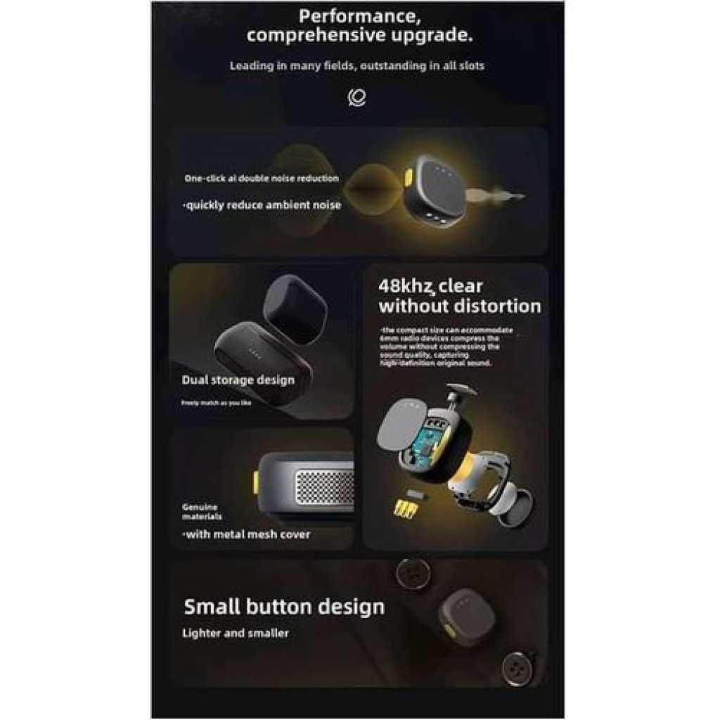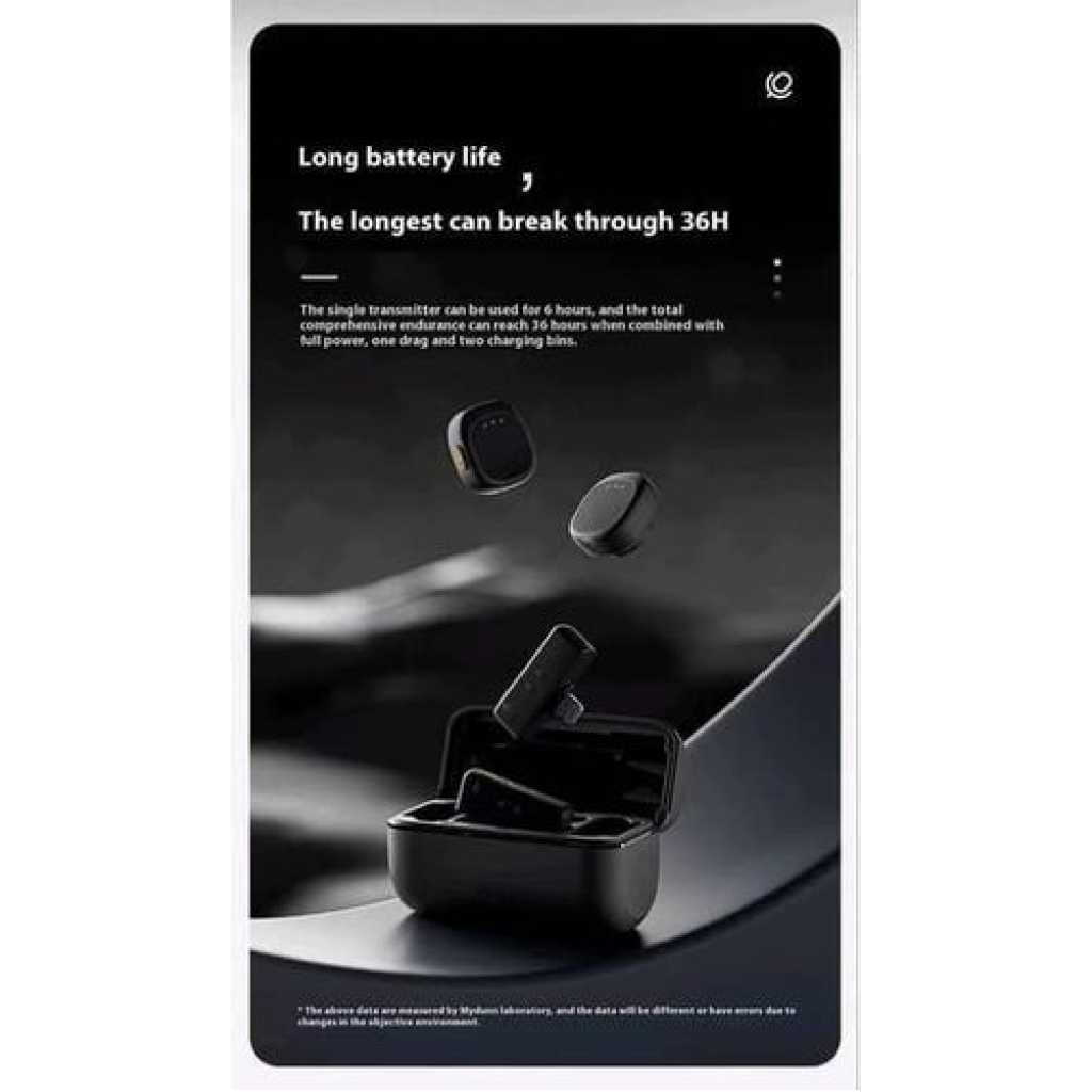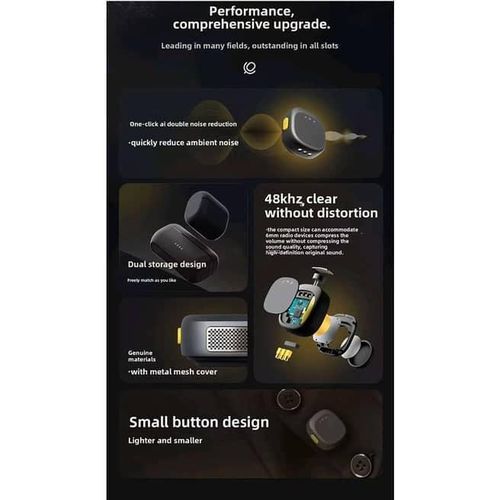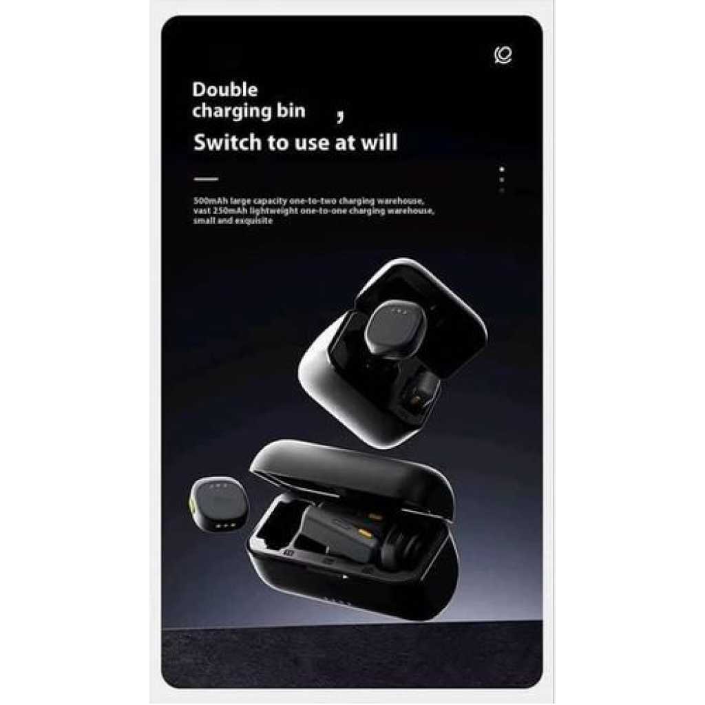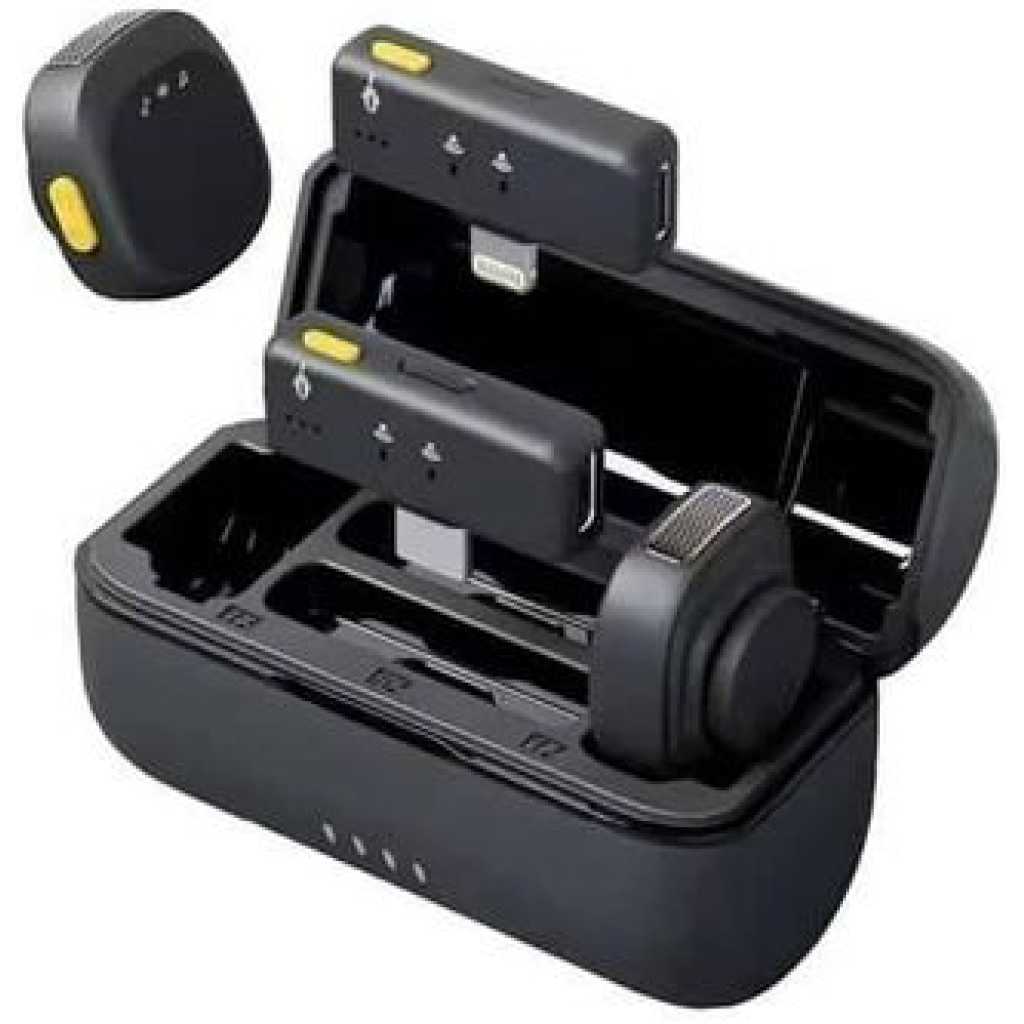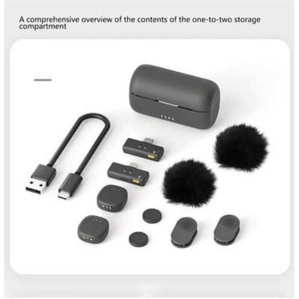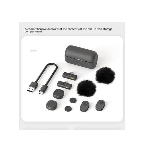 Key Features: Ultra clear sound: Features AI noise cancellation technology for clear, professional sound. Universal Compatibility: Works seamlessly with both iPhone and Type-C devices. Dual User Function: Includes two microphones and two receivers for simultaneous recording. SECURE AND EASY INSTALLATION: Comes with magnetic clips for quick and secure placement on clothing. Always Ready: Comes with a built-in charging case to keep the microphones charged and ready to use. Portable and Easy to Use: Lightweight and compact design with clear LED indicators for status monitoring.