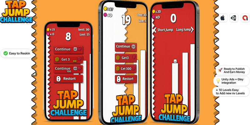 Tap Jump Challenge Casual Game. Tap Jump Challenge Unity Game Source Code! Perfect for mobile, this game is optimized for Android & iOS. easy to reskin