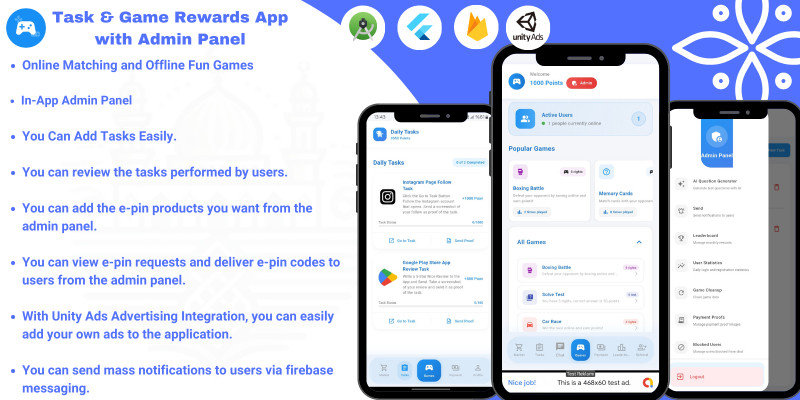 Task And Game Rewards App with Admin Panel. Reward app with multiplayer & solo games, tasks, and admin panel control.