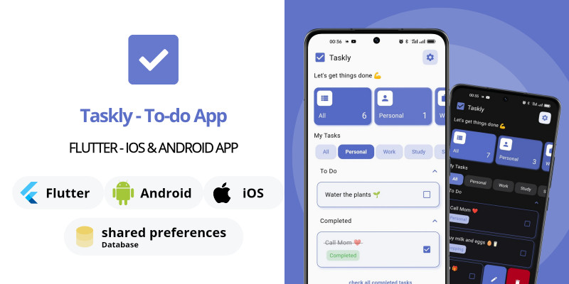 Taskly - To-do App - Flutter App Source Code. A sleek Flutter to-do app with dark/light mode, smooth animations. Perfect starter kit for productivity apps.