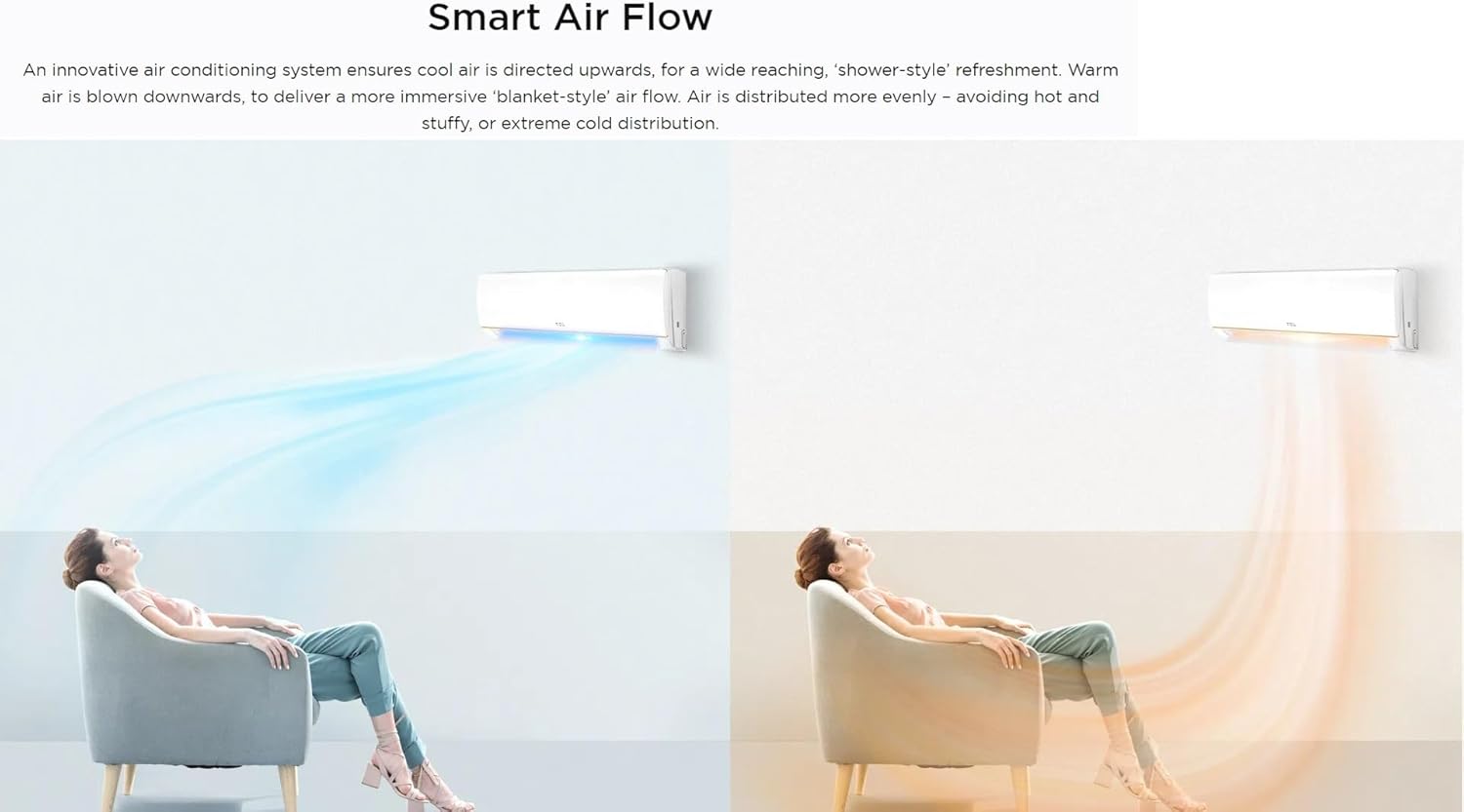 TCL 24000 BTU Wall Split Air Conditioner TAC-24CSA/XA41, Rotary Compressor AC, T3 Tropical, R410A Gas, Fast Cooling, Gold Fin, 4 Way Airflow, Sleep Mode. I Feel iFeel mode enables environmental temperature to be taken directly via a sensor built into the remote. Relax in more comfort, with high precision in-room readings and air delivery.