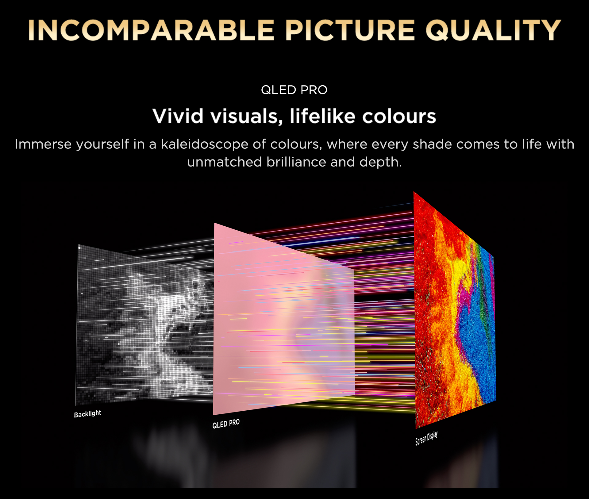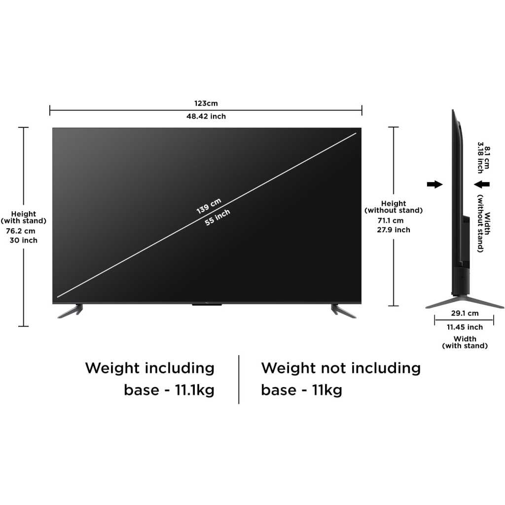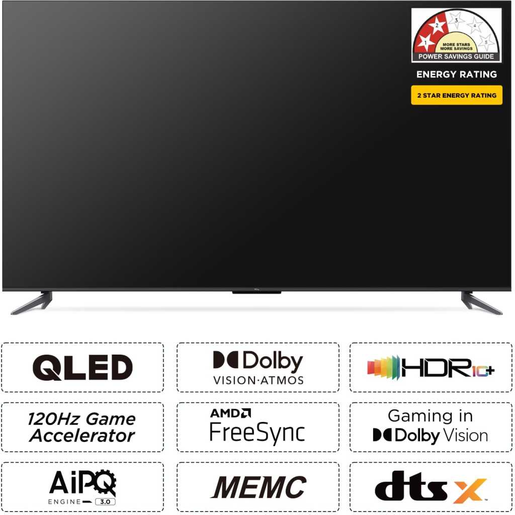 Key Features: · QLED PRO · AiPQ PRO PROCESSOR · T-SCREEN PRO · ONKYO 2.1CH · Slim & Uni-body · 144Hz VRR · Dolby Vision•Atmos · HDR10+ · Multiple Eye Care · 32GB Resolution: 4K Ultra HD (3840 x 2160) | Refresh Rate: DLG 120Hz | VRR 120Hz Connectivity: 3 HDMI Ports to connect set top box, Blu Ray players, gaming console | 1 USB ports to connect hard drive or other USB device | Ethernet | Wi-fi | Bluetooth | 1 Headphone output Sound: 35 Watts Output | DTS Virtual:X &Dolby Atmos Audio System Smart TV Features: Google TV | 2 GB RAM+32 GB ROM| DLG 120 Hz | Multiple Eye Care | ONKYO 2.1 CH | T-Screen Pro| Multiple Eye Care | DTS Virtual:X |Hands Free Voice Control Display: QLED Pro TV| Google TV| Dolby Vision -Atmos | HDR 10+ |AiPQ Pro Processor| T-SCREEN- PRO|Slim and Uni-Body Design |MEMC Warranty Information: 2 Year warranty provided by the manufacturer from date of purchase