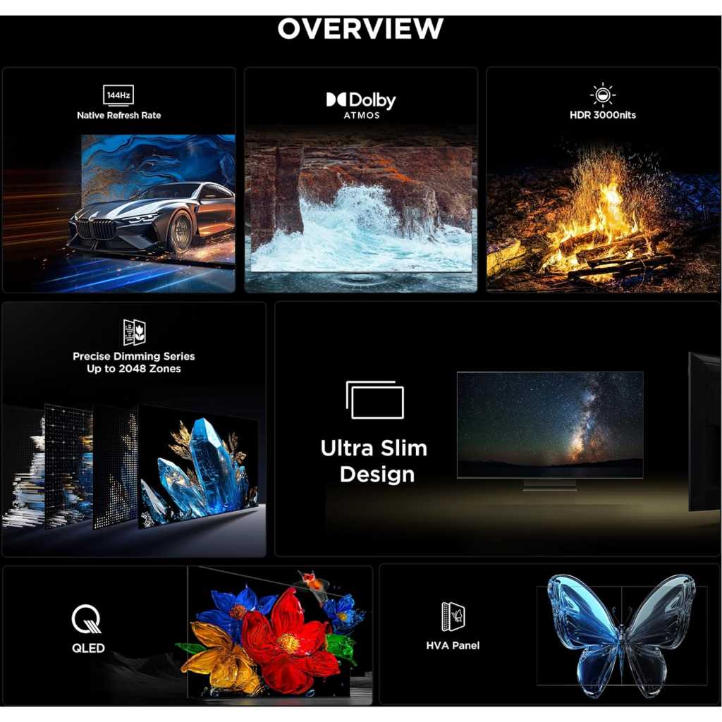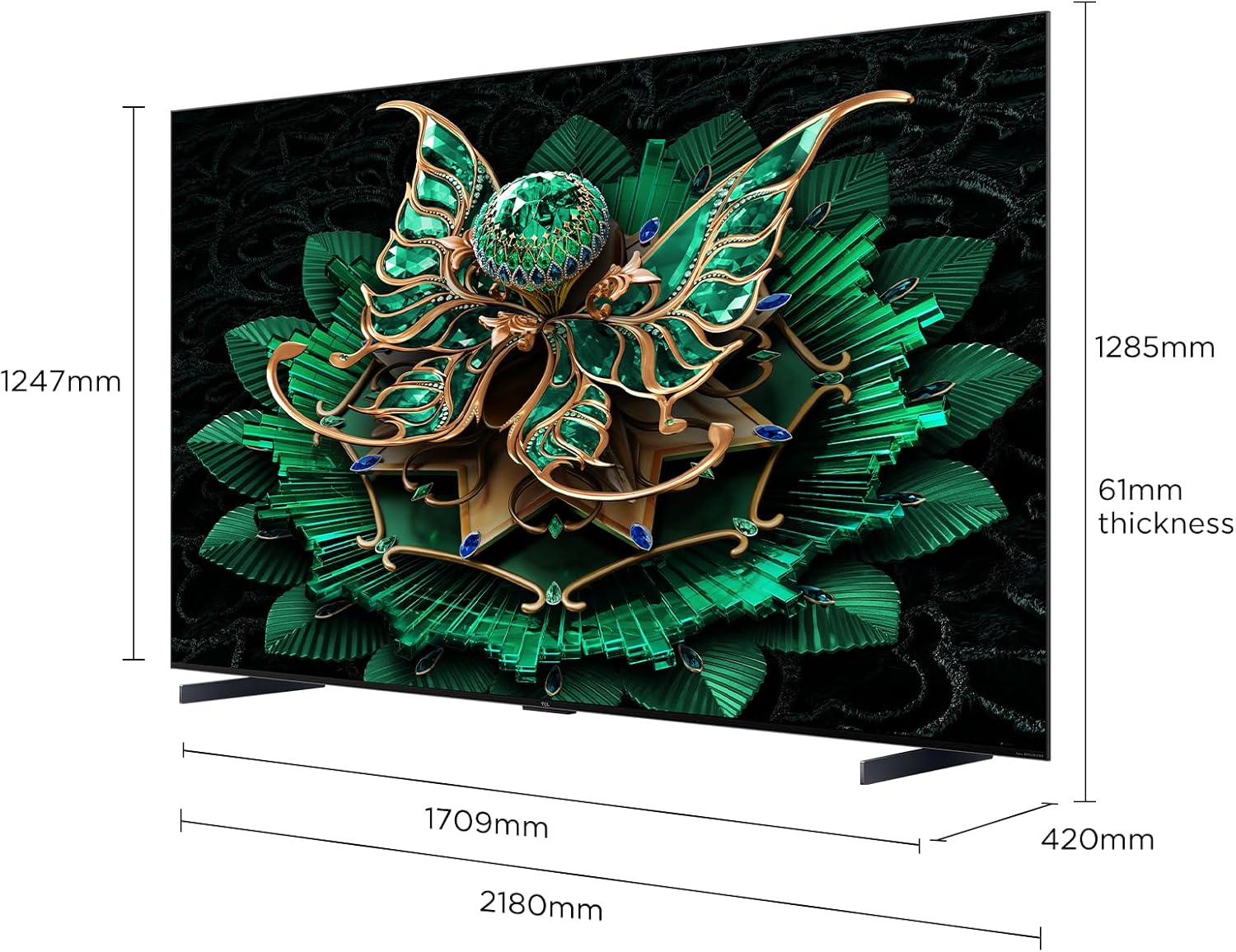 Key Features: TCL 98 Inch Smart TV 4K QD-Mini LED 98C7K (2025 Model). QD-Mini LED TV: Precise Dimming Series Up to 2880 Zones, More than a billion hues of perfect vivid color. HDR 3000nits: Blazing 3000-nit peak brightness for the most stunning HDR experience ever. 144Hz Native Refresh Rate: Unleash ultra-smooth motion with 144Hz Native Refresh Rate. Whether gaming or watching fast-action scenes, enjoy seamless fluidity and clarity that brings every frame to life. Audio by BANG & OLUFSEN: Indulge in premium sound with Audio by BANG & OLUFSEN. Immerse yourself in cinematic audio that perfectly complements the stunning visuals, delivering rich, clear, and dynamic sound. CrystGlow HVA Panel: 5x Contrast Enhancement, Low Reflection Film, >178° Viewing Angle, Energy-efficient.