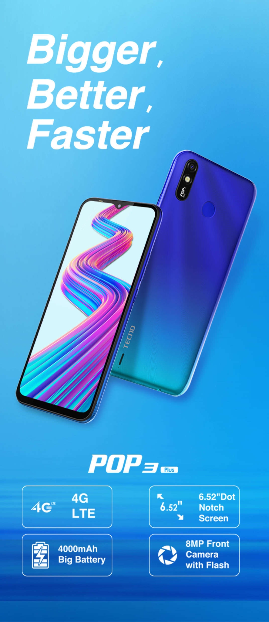 Tecno Pop 3 Plus Dual SIM 5.7″ 1GB RAM 16GB ROM Featured with 16GB ROM, there is more space for you to store your favourite memories and important files. Less worry of frequent clean-up to get more space. Practical and excellent as always. More View, More FunPOP 3 Plus comes with stunning 5.7” Fullview screen that brings you wider viewing area. With perfect screen ratio and clear resolution, you could browse more contents with less scrolling and touch more fun. Come and explore more wonderful through brand new POP 3 Plus. Long-lasting 3500mAh Battery , Stay ActiveEquipped with 3500mAh battery, your needs of power supply for daily work and life could be easily satisfied. More time to enjoy chatting with friends, taking selfies, playing games, or browsing websites as you like. Less worry of low battery and frequent recharging. With POP 3 Plus, always stay active. Capture Your Shining MomentsAdopting 8MP AI Selfie Camera with Flash, selfies taken by POP 3 would be clearer, brighter and more charming. No more worries of different scenarios, you could always capture glamorous selfies. 7 levels beauty mode are used to give natural retouch to your pictures. No need to go to make-up artist, AI beauty mode does professional beautification for you. Come and record more shining moments with POP 3 Plus. More Secure and Considerate Unlocking Smart FingerprintUnlock your phone instantly with just a single touch. Equipped with smart fingerprint sensor, POP 3 Plus gives you multiple security and privacy protection after you record your fingerprint information and start the function. Not only unlock your phone, you could also take photo, record calling, accept calling, dismiss alarm through the intelligent fingerprint sensor. Face Unlock 2.0 Unlock your phone speedily via “face scan”. With the newly added “Closed-Eyes Detection”on Face Unlock 2.0 version, less worry of unlocking your phone when you are sleeping or closing your eyes. The 2.0 version also offers screen fill-light in dark environment, more quickly unlocked in low light scenarios. Key Features: Processor: 1.3GHz Quad-Core RAM: 1 GB Internal Storage: 16 GB Display size: 5.7 inch IPS LCD capacitive touchscreen Main Camera: Single 5 MP Operating System: Android 8.1 Oreo; HiOS 3G Network: HSDPA 850 / 900 / 1900 / 2100 2G Network: GSM 850 / 900 / 1800 / 1900 Dual SIM: Dual SIM (Micro-SIM ,dual stand-by) SIM: Micro SIM