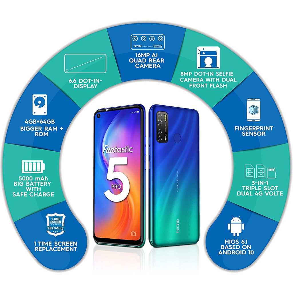 Key Features: Size: 6.6″ IPS LCD Memory: 64GB + 3GB RAM 16MP Quad Rear Camera, Front Camera: 8MP OS: Android Q CPU: Octa-Core Processor,4G VOLTE Battery: 5000mAh Batter