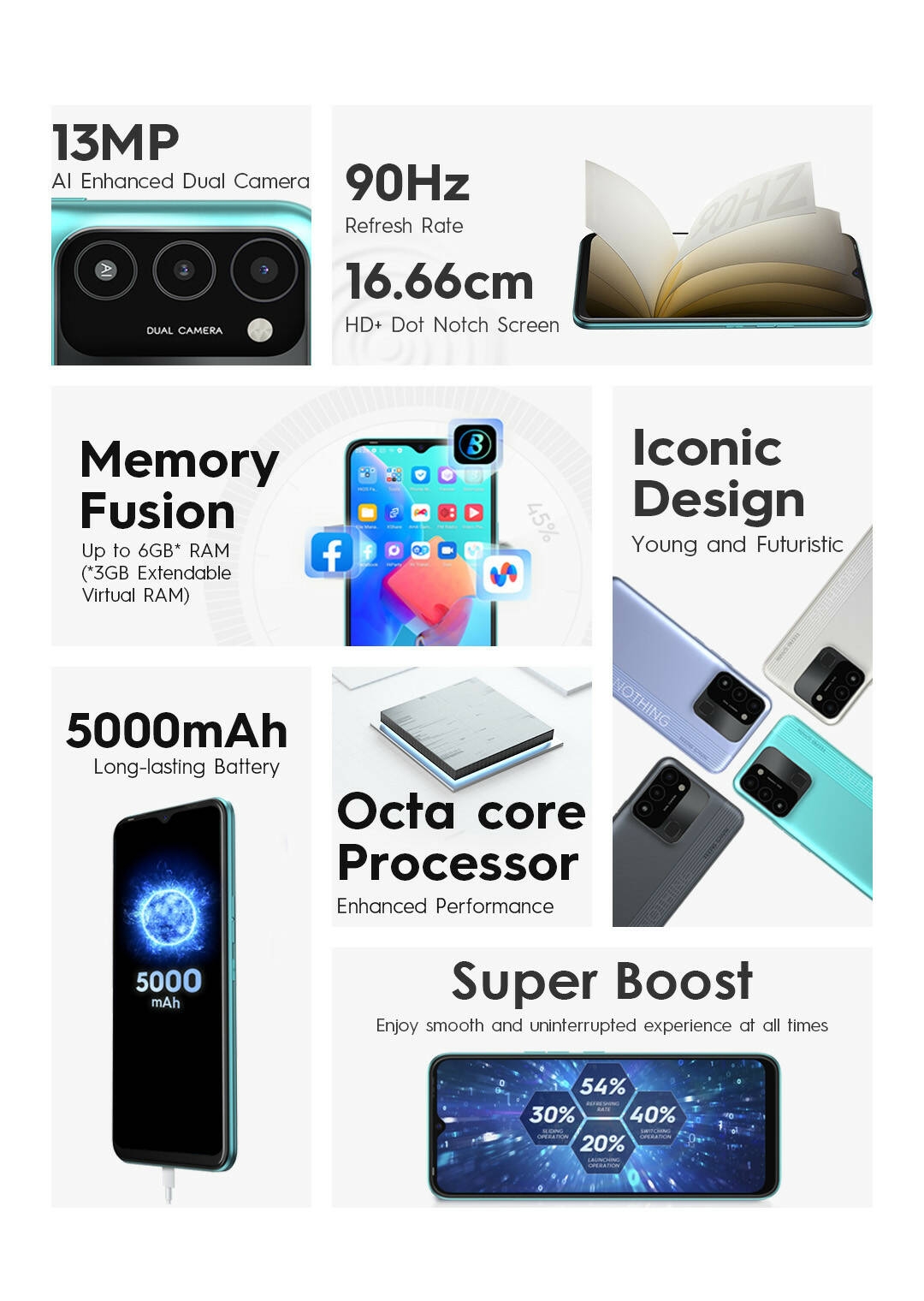Key Features: NETWORK Technology: GSM / HSPA / LTE SIM: Dual SIM (Nano-SIM, dual stand-by) Size: 6.6 inches PLATFORM: OS Android 11 (Go edition), HiOS 7.6 Internal: 64GB 3GB RAM MAIN CAMERA: Dual 13 MP, f/1.8, 27mm (wide) BATTERY Type: Li-Po 5000 mAh, non-removable