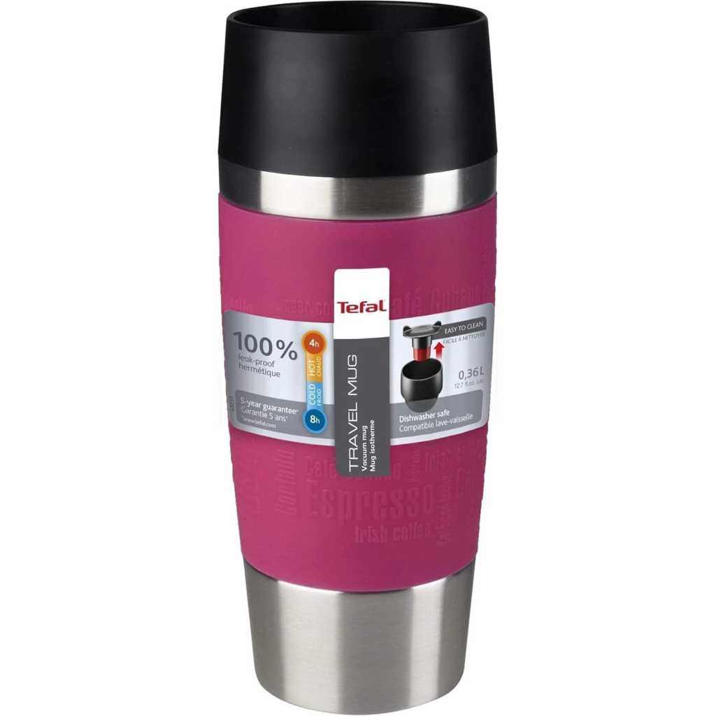 Tefal 0.36L Thermal Travel Mug K3082114 – Blue. For Drinks on the go: This large vacuum flask is the ideal companion for your drinks on the go: Take your hot coffee, tea or cold drinks with you wherever you go Easy Drinking: Thanks to the 360 Degree circular drinking aperture so you can drink from any direction Easy to take away: The 100 Percent leakproof thermal bottle comes with a handy quick press seal and can be easily opened with the press of a button Suitable conservation: Keep your beverages hot for up to 6 hours or cold for up to 12 hours 100 Percent Harmless: This ecodrink is BPA Free, dishwasher safe and is an environmentally-conscious option to avoid plastic bottles