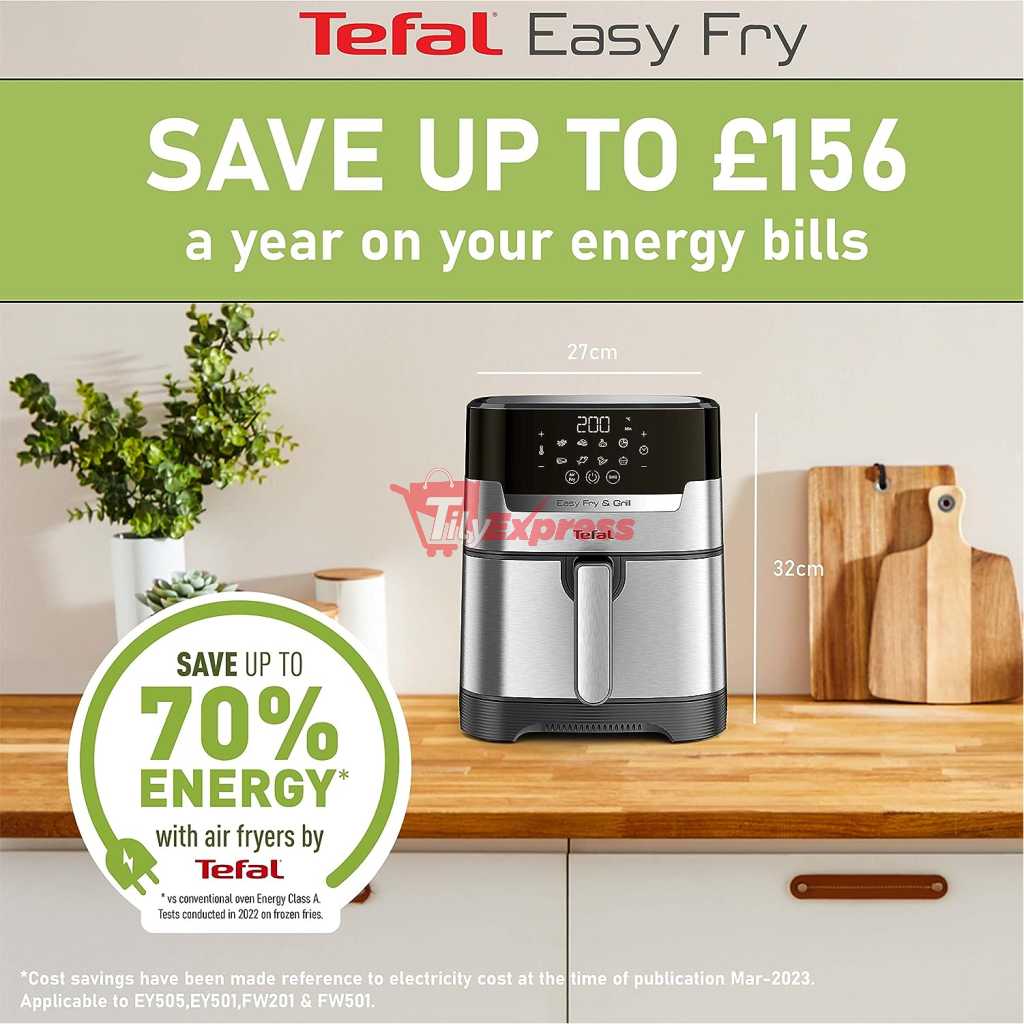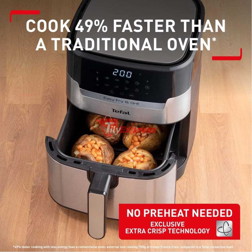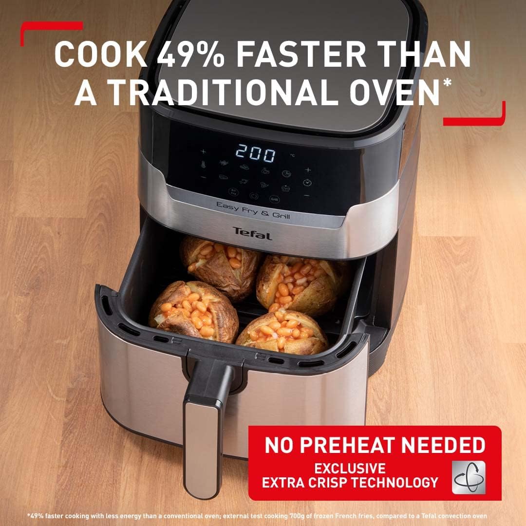 Tefal 4.2L Easy Fry Precision+ 2-in-1 Digital Air Fryer and Grill; 8 Programs inc Dehydrator Stainless Steel EY505D, 1550W. 2 WAYS TO COOK: Tefal’s first digital stainless-steel air fryer and grill in one. Exclusive Extra Crisp air frying technology maximises the crispiness of your food without compromising on flavour and moisture COOK FASTER AND SAVE ENERGY: Prepare a wide variety of meals 49% faster* than in a conventional oven, get that crispy crunch and taste you love in half the amount of time. Save up to 70% energy** whilst saving up to £156 on your energy bills NO PREHEAT NEEDED: Extra Crisp air frying technology delivers instant heat, so there’s no need for preheating. Just choose from 8 automatic programs or set your own temperature (80-200°C) and time (<60mins) and start cooking straight away SMOKELESS INDOOR GRILLING: Enjoy grilling indoors with 98% less smoke***. Get that juicy grilling taste with our one-of-a-kind, die-cast aluminium Sizzling Grill Plate A HEALTHIER ALTERNATIVE: Air frying offers a quick and easy way to make healthy versions of all your favourite foods – fresh or frozen. From crispy chips and juicy burgers to grilled halloumi and falafel. And all with 99% less added fat**** NO OVEN REQUIRED: Cooking crisp, tasty food faster than an oven (and with less faff!), Easy Fry Precision 2-in-1 brings a new meaning to ‘fast food’. Enjoy crispy and juicy chicken thighs in just 20 minutes versus 40 minutes in a conventional oven EASY CLEAN: With its clever easy-to-clean design, Tefal Easy Fry makes mealtimes a cinch. Simply pop the drawer and grill plate straight in the dishwasher – job done! Then sit back and enjoy your delicious dinner knowing clean-up is taken care of Technical Details Key Features: Tefal 4.2L Easy Fry Precision+ 2-in-1 Digital Air Fryer and Grill; 8 Programs inc Dehydrator Stainless Steel EY505D, 1550W. 2 WAYS TO COOK: Tefal’s first digital stainless-steel air fryer and grill in one. Exclusive Extra Crisp air frying technology maximises the crispiness of your food without compromising on flavour and moisture COOK FASTER AND SAVE ENERGY: Prepare a wide variety of meals 49% faster* than in a conventional oven, get that crispy crunch and taste you love in half the amount of time. Save up to 70% energy** whilst saving up to £156 on your energy bills NO PREHEAT NEEDED: Extra Crisp air frying technology delivers instant heat, so there’s no need for preheating. Just choose from 8 automatic programs or set your own temperature (80-200°C) and time (<60mins) and start cooking straight away SMOKELESS INDOOR GRILLING: Enjoy grilling indoors with 98% less smoke***. Get that juicy grilling taste with our one-of-a-kind, die-cast aluminium Sizzling Grill Plate A HEALTHIER ALTERNATIVE: Air frying offers a quick and easy way to make healthy versions of all your favourite foods – fresh or frozen. From crispy chips and juicy burgers to grilled halloumi and falafel. And all with 99% less added fat**** NO OVEN REQUIRED: Cooking crisp, tasty food faster than an oven (and with less faff!), Easy Fry Precision 2-in-1 brings a new meaning to ‘fast food’. Enjoy crispy and juicy chicken thighs in just 20 minutes versus 40 minutes in a conventional oven EASY CLEAN: With its clever easy-to-clean design, Tefal Easy Fry makes mealtimes a cinch. Simply pop the drawer and grill plate straight in the dishwasher – job done! Then sit back and enjoy your delicious dinner knowing clean-up is taken care of