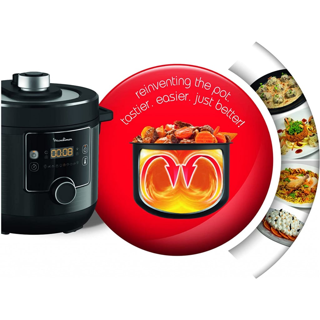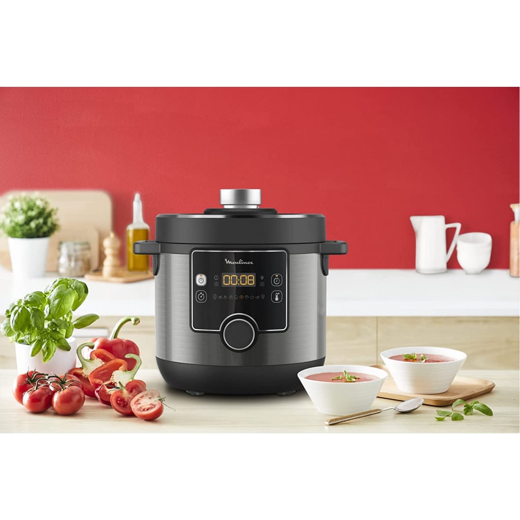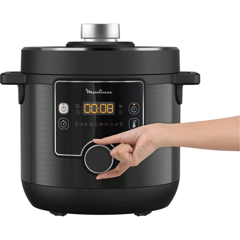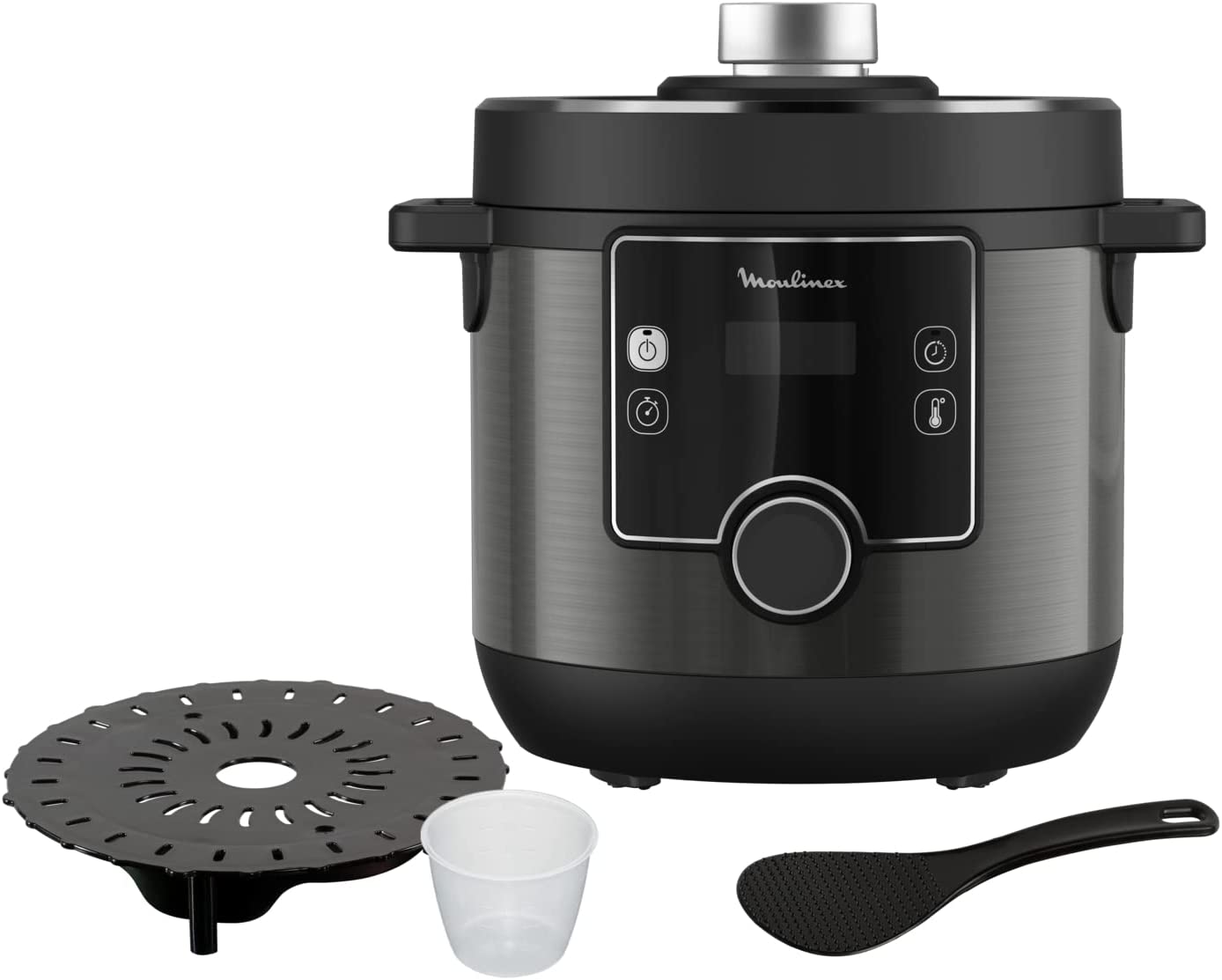 Key Features: Tefal Turbo Cuisine Electrical Pressure Cooker/Rice Cooker, 7.6 Litre, 1200 Watts, Black, CE777865 Versatile fast multicooker with an XL 7.6 L capacity that serves up to 8 people Tefal’s exclusive Spherical Bowl for perfect home-cooked meals day after day 10 automatic programs for all your needs from starter to dessert, for hearty stews, express cooking, and more Monitor-free cooking and express pressure cooking, for a more convenient cooking experience with fast results Quality backed by our 15-year repairability guarantee—to help protect the environment and cut down on waste Easy single-knob control and non-stick coating for home cooking that couldn’t be easier Endless inspiration with inventive and delicious Tefal recipes online and in the included recipe book One-click steam release button releases pressure with total safety and convenience