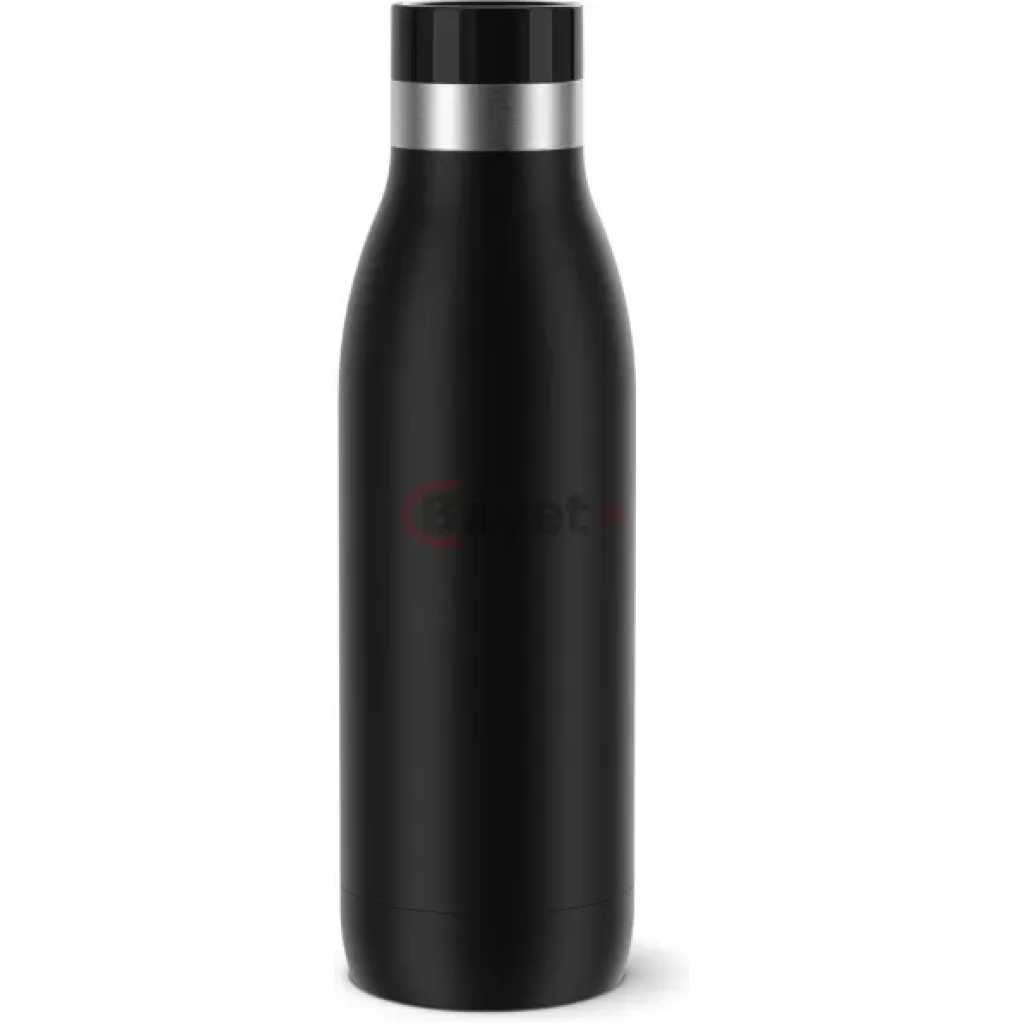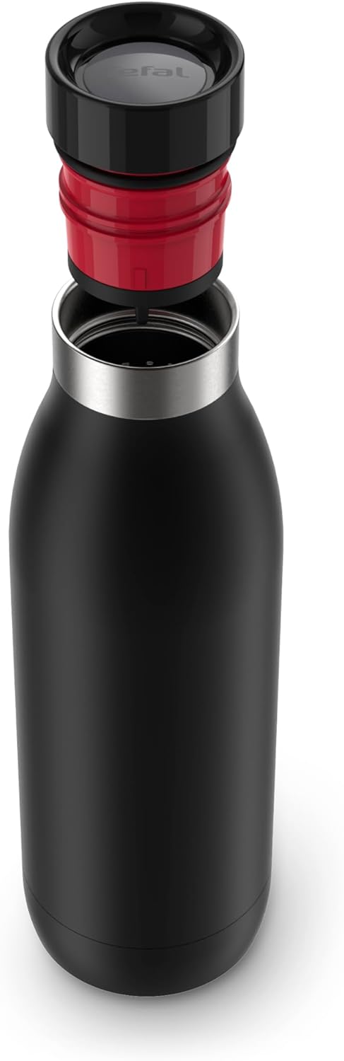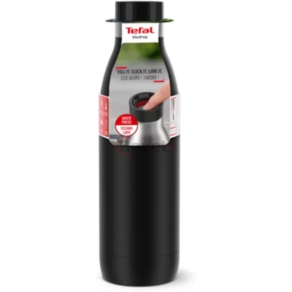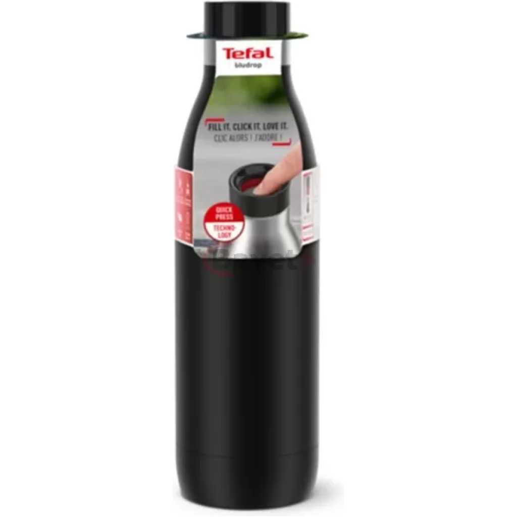 TEFAL Bludrop Water Bottle N3110910, Reusable Stainless Steel Bottle, Hot and Cold Drinks, Leak-Proof, 0.7 L, Black. The Tefal BLUDROP Drinking Bottle for functional style Reusable bottle in environmentally friendly stainless steel, with a slim, ergonomic design and robust powder-coating finish on the outside Quick-press 360 drinking lid for easy opening/drinking from any angle Stainless steel hydration bottle for excellent temperature retention: hot drinks stay warm for up to 12 hours and cold drinks stay cool for up to 24 hours 100% dishwasher-safe for perfect hygiene and effortless cleaning.100% leak-proof for total peace of mind on the go.A range of stylish colours ensures the perfect fit for any lifestyle.Ideal size for on-the-go living: 0.5L volume