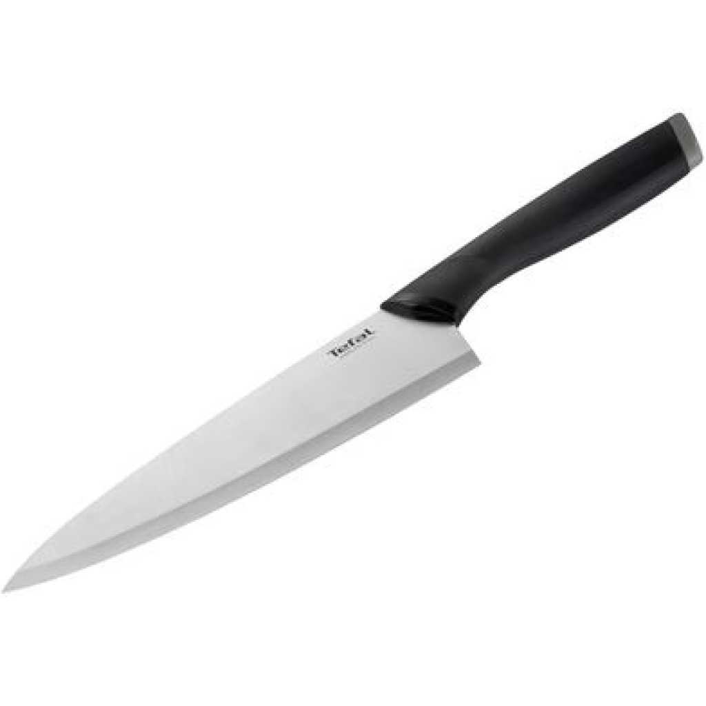 TEFAL COMFORT STAINLESS STEEL CHEF KNIFE 20cms- K2213214- Black Stainless steel chef knife 20 cm Perfectly mince, slice and chop large pieces of meat and vegetables: robust and stable! Comfort Knives’, the perfect knives to start with maximum comfortable usage! A complete assortment with both Stainless Steel and Ceramic offer. Ergonomic handle with soft touch for an optimal comfort and control of usage.High quality stainless steel Essential Comfort Knives: the perfect starter knife set! With Essential Comfort Knives, enjoy a complete assortment of knives and accessories in both stainless steel and ceramic, featuring soft-touch ergonomic handles for optimal comfort and control. High-quality stainless steel blades provide excellent cutting performance and resistance and ceramic blades offer outstanding precision, while safe blade covers protect each blade shape, for guaranteed security and easy storage. 14 products for high cutting performance: – Paring knife 9 cm (available in ceramic and stainless steel) – Utility knife 12 cm (available in ceramic and stainless steel) – Chef knife 15 cm (available in ceramic and stainless steel) – Chef knife 20 cm – Bread knife 20 cm – Slicing knife 20 cm – Santoku 12 cm (available in ceramic and stainless steel) – 4 steak knives – Cheese knife – Kitchen Shears Essentials COMFORT ZONE LONG LASTING PERFORMANCE CUTTING PERFORMANCE Features Active Part Material: Stainless Steel Dimension: 20cms Handle Color: Black+Grey – Hippo Type: Chef Comfort Knives’, the perfect knives to start with maximum comfortable usage! A complete assortment with both Stainless Steel and Ceramic offer. Ergonomic handle with soft touch for an optimal comfort and control of usage.High quality stainless steel FAQ WHERE CAN I DISPOSE OF MY APPLIANCE AT THE END OF ITS LIFE SPAN? Your appliance contains valuable materials which can be recovered or recycled. Leave it at a local civic waste collection point. WHERE CAN I BUY ACCESSORIES, CONSUMABLES OR SPARE PARTS FOR MY APPLIANCE? Please go to the “ Accessories ” section of the website to easily find whatever you need for your product. WHAT ARE THE GUARANTEE CONDITIONS OF MY APPLIANCE? Find more detailed information in the Guarantee section of this website.