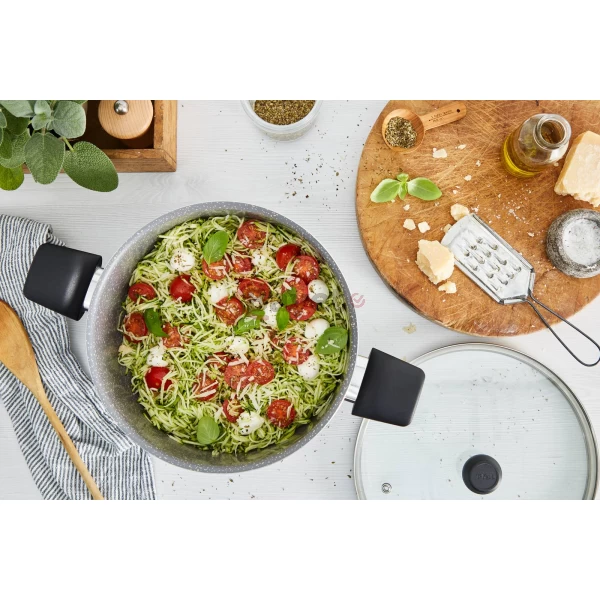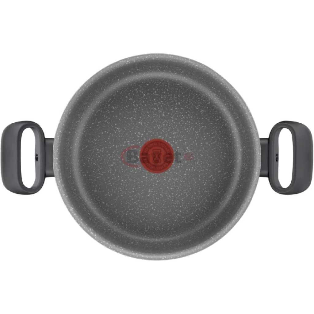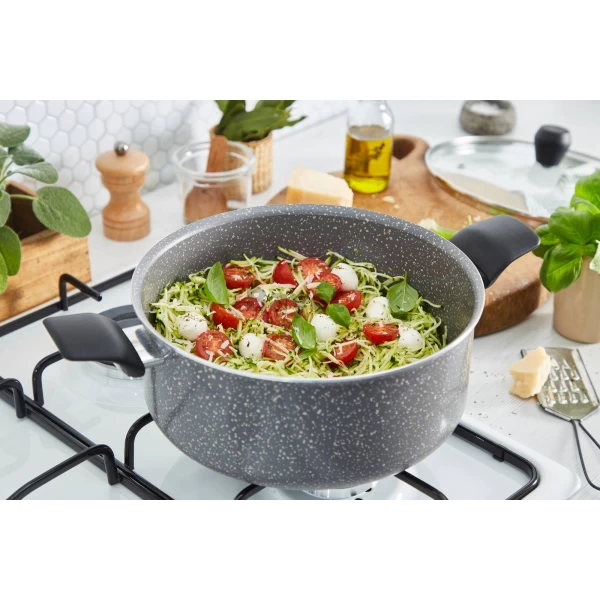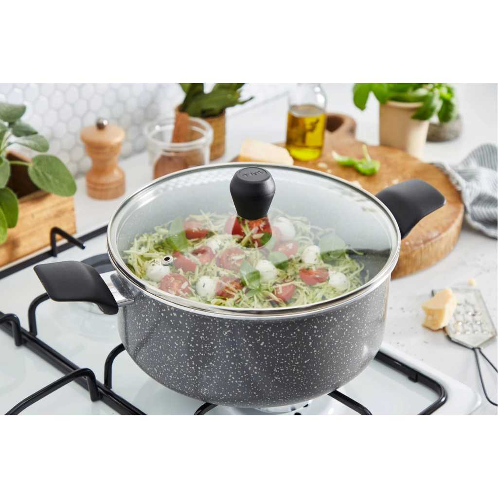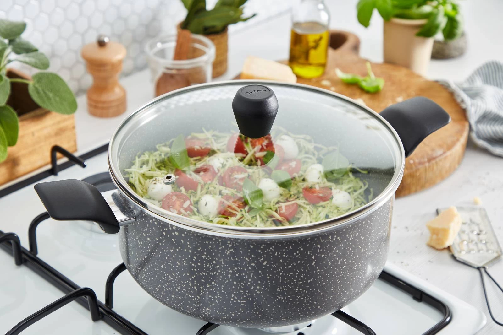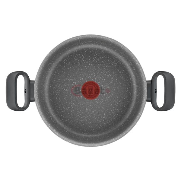 TEFAL Cook Natural 24 cm Non-Stick Aluminium Granite Stew Pot B5794602 – Grey. The new Thermo-Spot starts cooking at the ideal temperature for easy and delicious results The new Powerglide coating, for longer extra glide: easy to use and easy to clean The ergonomic handle: easy to handle Open shape and pouring spout to serve food easily Lightweight for easy and convenient use Non-stick exterior coating: easy to clean Dishwasher safe 2X Titanium Coating FLAME PROTECT: For maximum resistance to dynamic cooking on gas stoves Compatible with all heat sources except induction