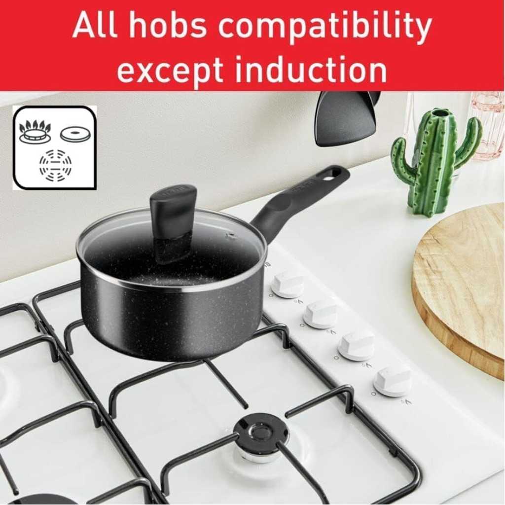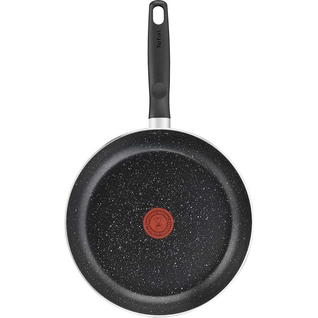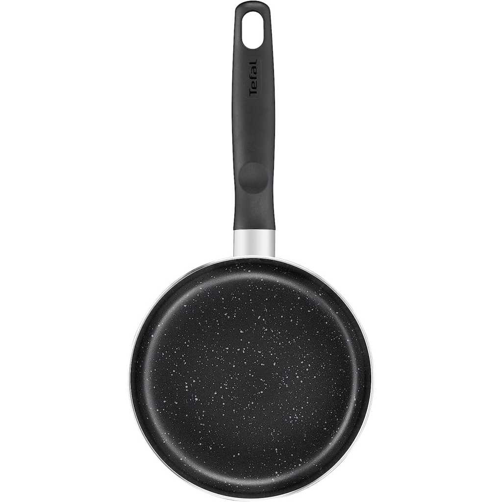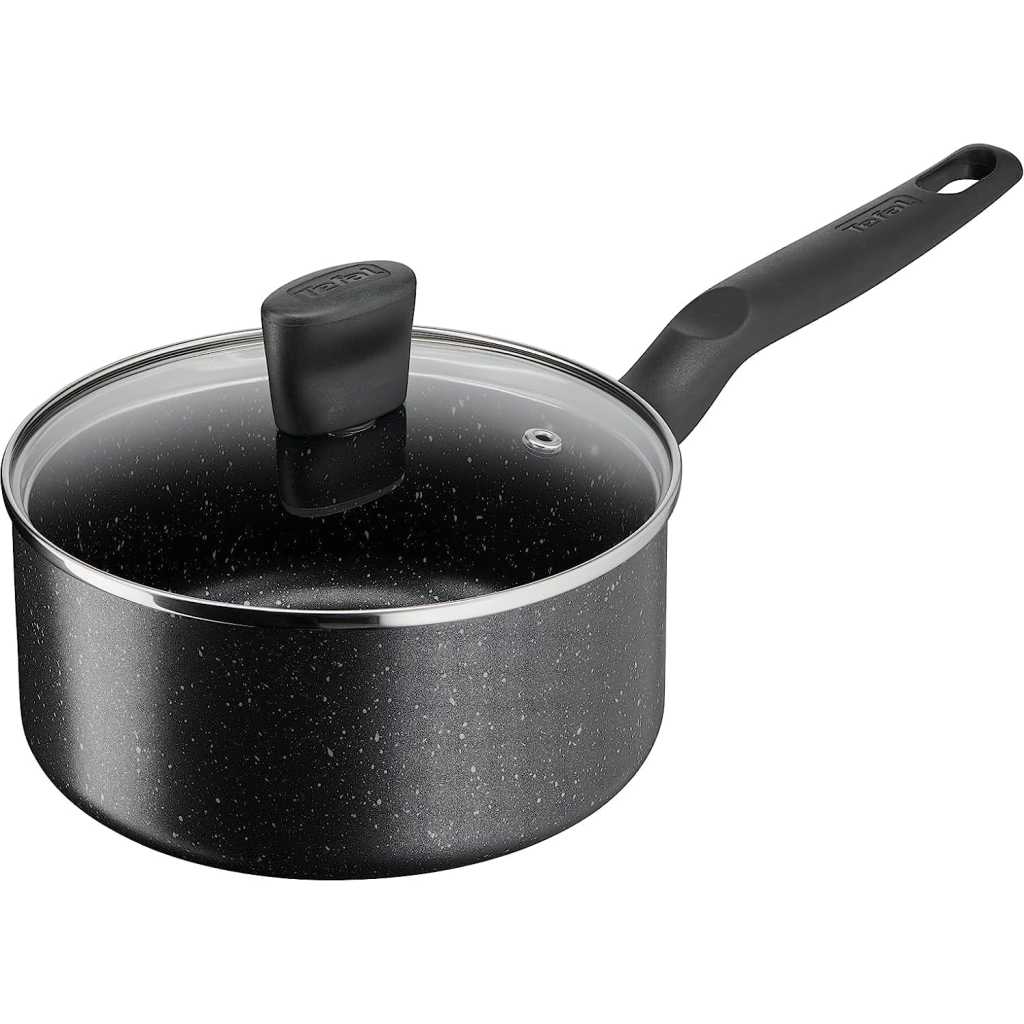 Key Features: Tefal Dark Stone, 9 Pcs Non-stick Cookware Set, Safe Coating, Heat indicator, Ergonomic Handles, Glass Lid, B491S985 Material Aluminum Coating Titanium Non-stick Lids Glass Suitable for Gas, Electric, Ceramic hobs Color Black Marble Set Includes Pot 20cm, Pot 24cm, Saucepan 16cm, Frypan 28cm, Spoon, Ladle.