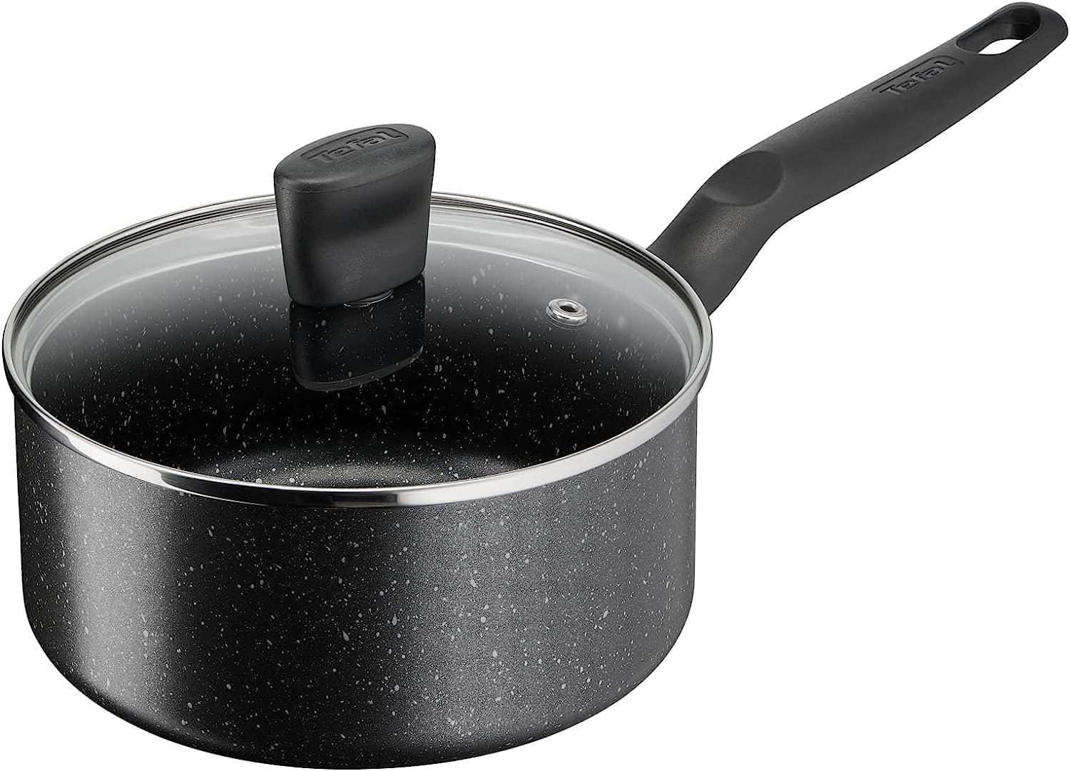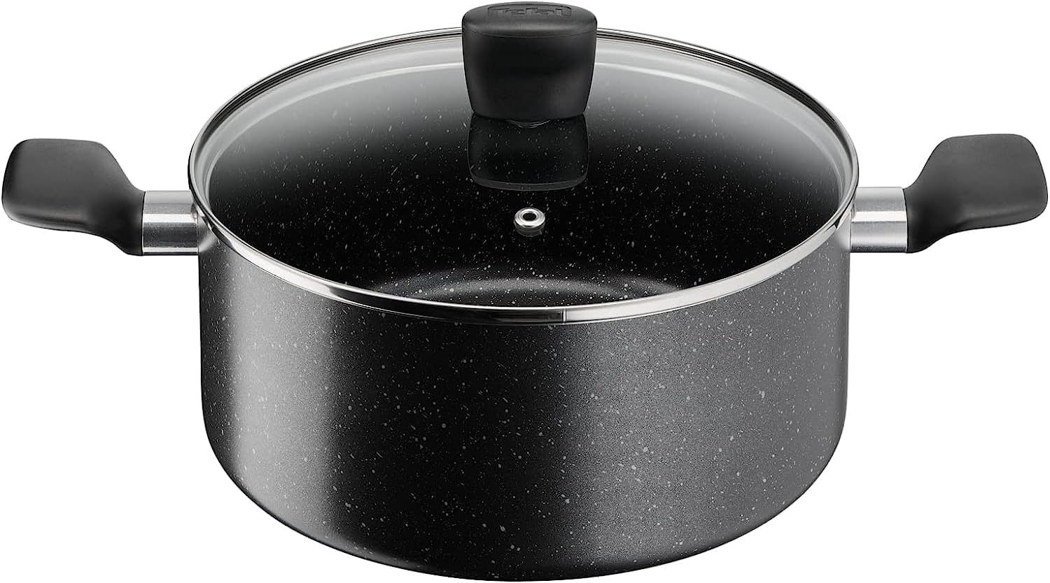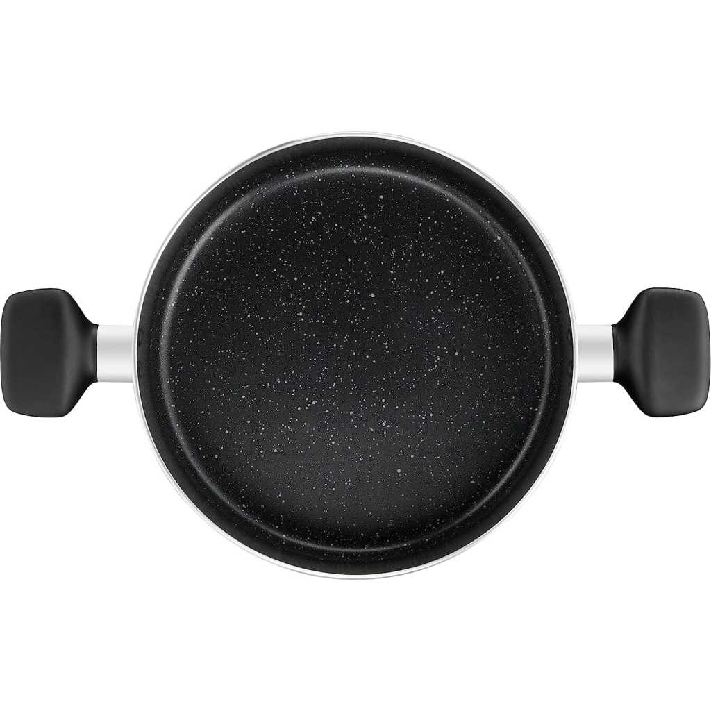 Key Features: Tefal Dark Stone, 9 Pcs Non-stick Cookware Set, Safe Coating, Heat indicator, Ergonomic Handles, Glass Lid, B491S985 Material Aluminum Coating Titanium Non-stick Lids Glass Suitable for Gas, Electric, Ceramic hobs Color Black Marble Set Includes Pot 20cm, Pot 24cm, Saucepan 16cm, Frypan 28cm, Spoon, Ladle.