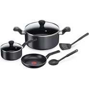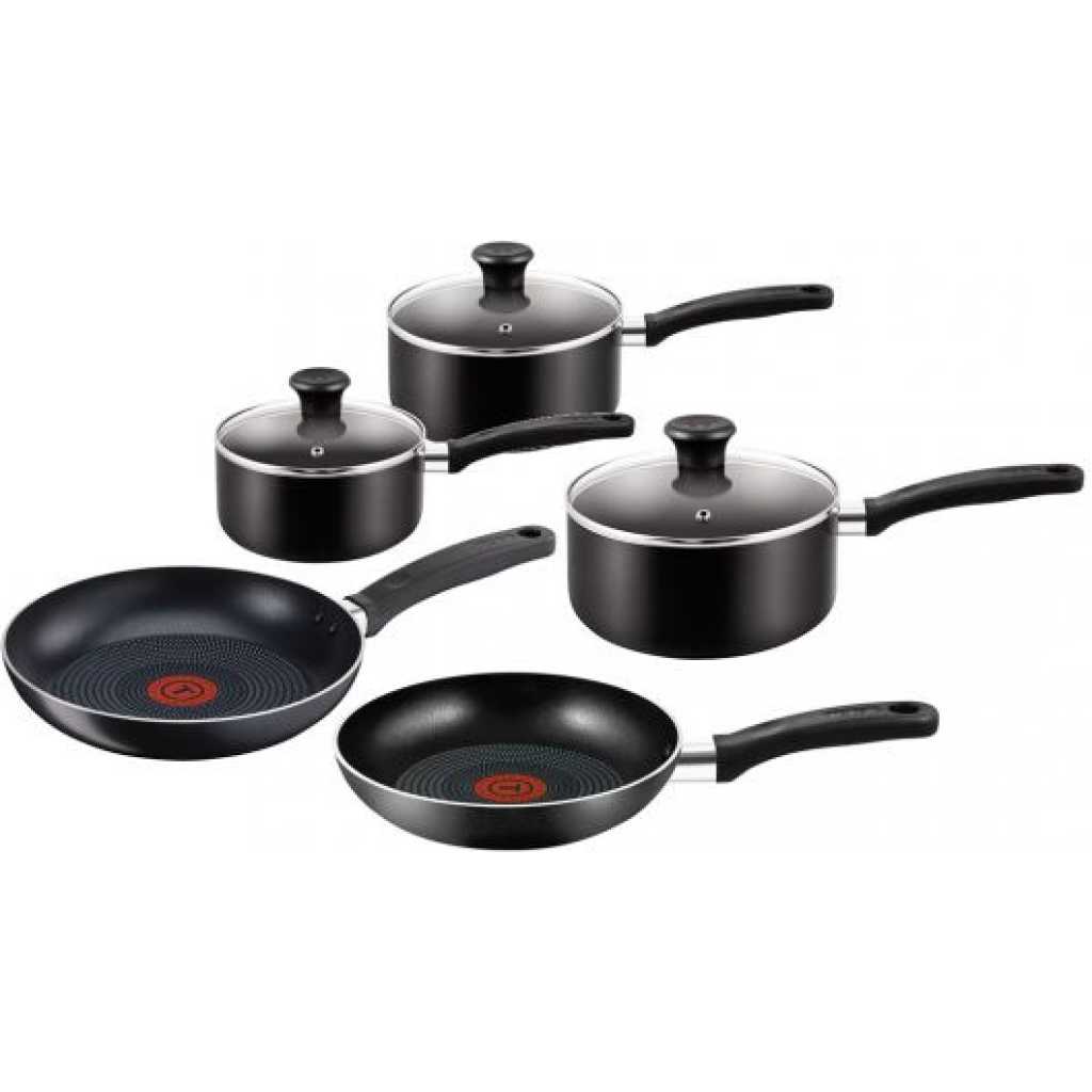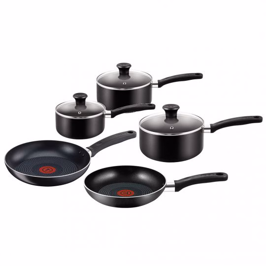 Meet Tefal Essential: An everyday cooking solution for the beginner chef designed to make cooking delicious meals effortless. The iconic Thermo-Spot® heat indicator changes to solid red to let you know when your pan has reached the ideal cooking temperature and it’s time to add your ingredients. No more under or overheating your food; Thermo-Spot® makes it easy to cook like a professional! Essential also features Tefal’s Powerglide non-stick coating. Extra-durable, this coating delivers longer non-stick performance. Even the exterior of the pans are non-stick which makes cleaning a breeze – easily wash by hand, or pop it in the dishwasher. Handles are designed to be ergonomic and comfortable in the handle for a secure grip. The pans are suitable for use with all hob types, except induction, and are ovenproof up to 175°C (Gas Mark 4, 350°F) for an hour – so you can start a meal on the hob and finish it off in the oven. Tefal Essential 5 Piece Set includes: 16cm, 18cm & 20cm Saucepans with lids, 20cm & 24cm Frying pans. Easy-to-use all hobs except induction range with advanced features for delicious everyday cooking results. Powerglide durable and easy to clean coating.Glass lid for perfect monitoring. Thermo-Spot® marking turns full red when the pan reaches the ideal temperature, for perfect searing performance made easy. Key Features: Cooked to perfection: Tefal’s unique Thermo-Spot® heat indicator turns solid red when the pan has reached the ideal cooking temperature. Powerglide non-stick: Anti-scratch coating reinforced with mineral particles for durable non-stick performance Easy cleaning: Non-stick inside and out for simple cleaning – or just pop it in the dishwasher!Glass lids: Easily monitor food whilst cooking.