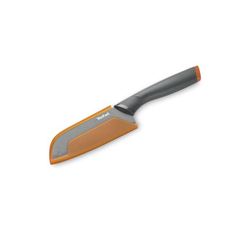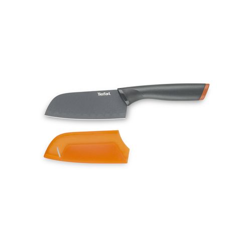 TEFAL Fresh Kitchen Santoku Knife 12cms- K1220114 – Grey To cut and slice any type of Sticky Food. Grooves on the blade to peel off food. Stainless steel blade with titanium reinforced non-stick coating for better strength and easy cleaning. Soft touch for optimized comfort and cutting control. Safe use thanks to a colorful and translucent protective sheath for additional protection and easy storage. Non-stick coating: very easy use and cleaning. Fresh Kitchen knives: never before has performance and fun been so well combined into a single product! With Fresh Kitchen knives, enjoy a complete assortment of knives with a non-stick stainless steel blade offering extreme performance, strength and ease of use, an ergonomic handle soft to the touch for optimal comfort, safety protections on the blades, guaranteed safety and easy storage. 7 products for excellent cutting performance: – Peeling knife 9 cm – Office knife 12 cm – Chef knife 15 cm – Santoku knife 12 cm – Slice knife 20 cm – Chef knife 20 cm – Steak knife 11 cm essential ANTI ADHESIVE TITANIUM COATING- Stainless Steel blade with titanium reinforced non-stick coating for better strength and easy cleaning COMFORT ZONE – Soft touch for optimized comfort and cutting control BLADE SECIRUTY PROTECTION PROVIDED – secure use thanks to a colorful and translucent protective sheath for additional protection and safe storage DISH WASHER COMPATIBLE criteria Material of the active part: Stainless Steel / Non- Stick dimension: 12cms Handle color: Grey-Java Grey Pepper type: Santoku Handle type: soft Touch With Fresh Kitchen knives, enjoy a complete assortment of knives with a non-stick stainless steel blade offering extreme performance, strength and ease of use, an ergonomic handle soft to the touch for optimal comfort, safety protections on the blades, guaranteed safety and easy storage. 7 products for excellent cutting performance: – Peeling knife 9 cm – Office knife 12 cm – Chef knife 15 cm – Santoku knife 12 cm – Slice knife 20 cm – Chef knife 20 cm – Steak knife 11 cm Frequently Asked Questions WHERE CAN I DROP OFF MY DEVICE WHEN IT REACHES THE END OF ITS LIFE? Drop your device in a selective sorting centre or waste disposal centre. WHAT ARE THE WARRANTY CONDITIONS FOR MY PRODUCT? All information is detailed in the Warranty section of this site. Key Features: 12cms Fresh Kitchen Santoku Knife To cut and slice any type Sticky food Stainless Steel blade Titanium reinforced non-stick coating Blade Security Protection Dish washer saf