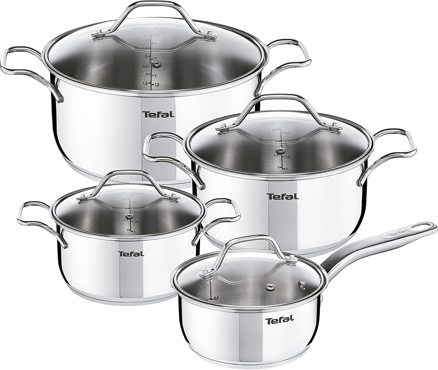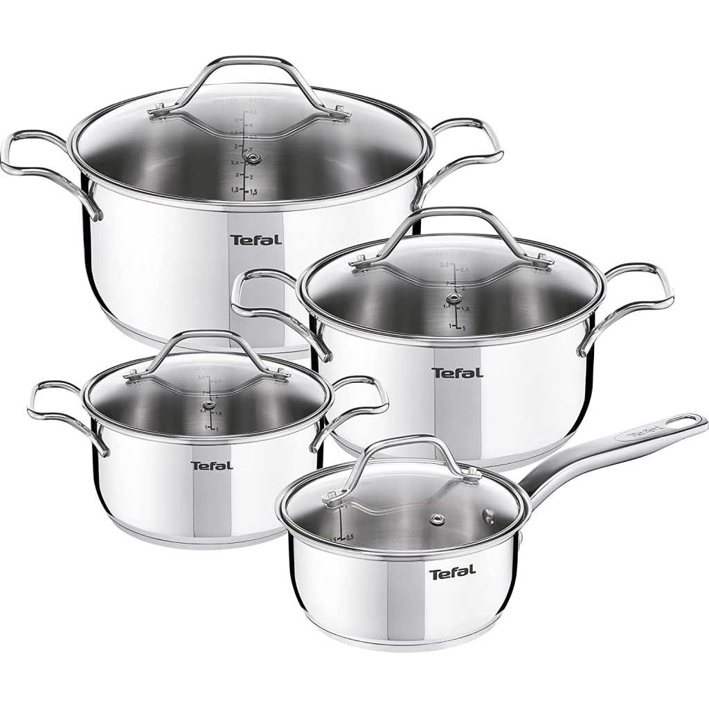 Key Features: Tefal Intuition 8pc Stainless Steel Cooking Set A702S885. 8 pieces set. Compatibel with all heat sources including induction. Smart pouring edges. Easy measuring marks to control quantities. Glass lids for added convenience and tracking of cooking process. Full stainless steel lids. Oven compatible up to 250 degrees except for glass lids. 4 saucepans (20, 24 & 28cm diameter) with 1.3 l, 2.7 l and 5 l capacity. 16 cm saucepan with 1.3 l capacity. 4 glass lids. They are made of the highest quality 18/10 stainless steel alloy, ensuring high rust resistance for long lasting performance.