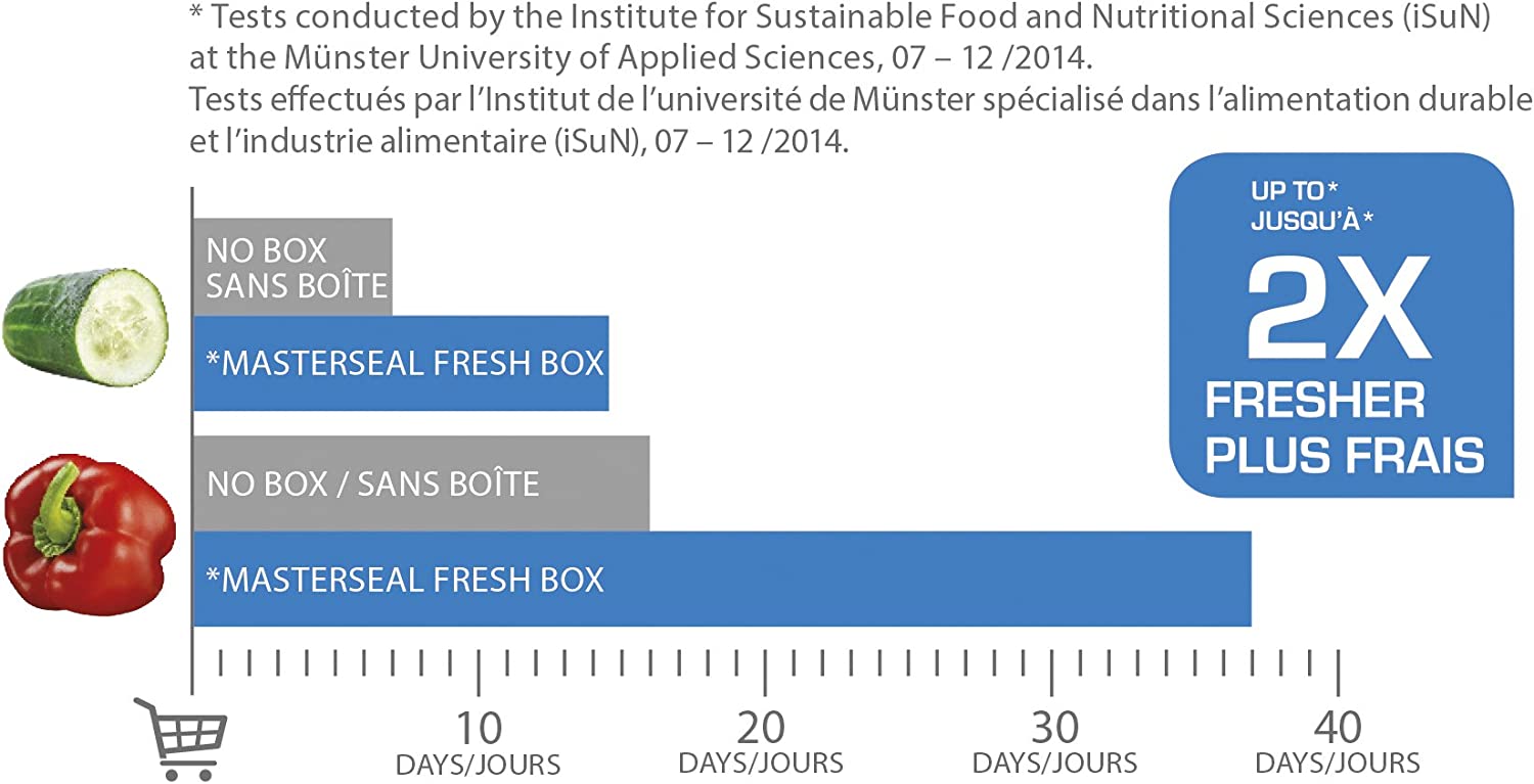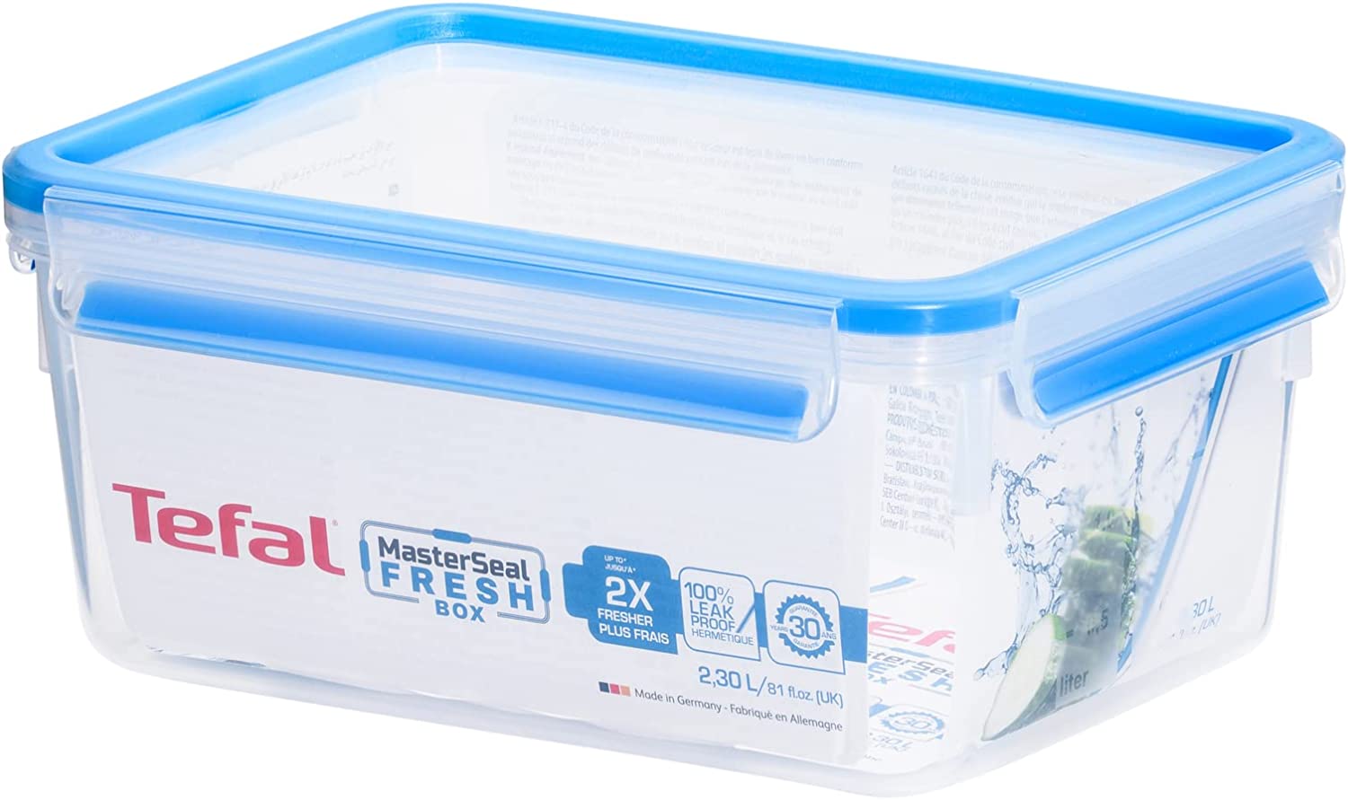 Key Features: Tefal K3021512 MasterSeal Fresh Box, Plastic Food Storage Container, Keeps Food Fresher for Longer and 100 Percent Leakproof, 2.2 Litre Suitable conservation: Distinct freshness seal keeps food fresh for up to 2 x longer 100 Percent leakproof: Thanks to the distinct freshness seal in the lid, you can transport your food safely 100 Percent hygiene: The freshness seal in the lid has no gaps for germs to form, so food stays fresh for longer: The freshness seal also acts as an odour barrier 100 Percent safe: Made using BPA-free materials only and is certified as baby food storage safe Guarantee: This plastic container is made in Germany and has a 30 years guarantee