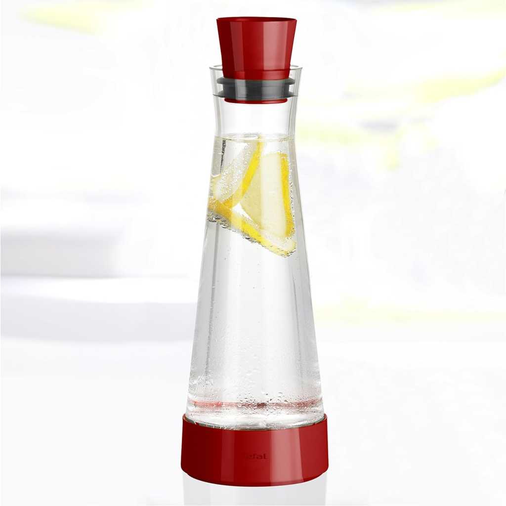 Key Features: Tefal K3053112 Flow Slim Friends, 1 Litre Wine Decanter and Water Carafe with Cooling Base and Non-Drip Lid, Rasberry. Integrated cooling element keeps drinks cold for up to 4 hours Easy to use with a serving spout for drip-free pouring The lid closes automatically after pouring, protecting beverages from insects and leaves Fits inside all standard refrigerator doors for easy storage 1 Litre capacity, made of a high-quality glass and plastic combination