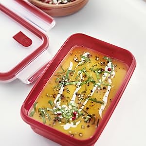 Tefal K3102312 Master Seal Micro Rectangle Food Storage with Inserts, Red/Clear, 1 Litre From the manufacturer Key Features: Tefal K3102312 Master Seal Micro Rectangle Food Storage with Inserts, Red/Clear, 1 Litre Just open the valve to use in the microwave – no need to remove lid Gap-free seal forms a germ and odour barrier to keep food fresh for longer 100% leak-proof design avoids any accidental spillages on the go Made using BPA-free materials only and certified baby food safe Dishwasher, microwave and freezer friendly