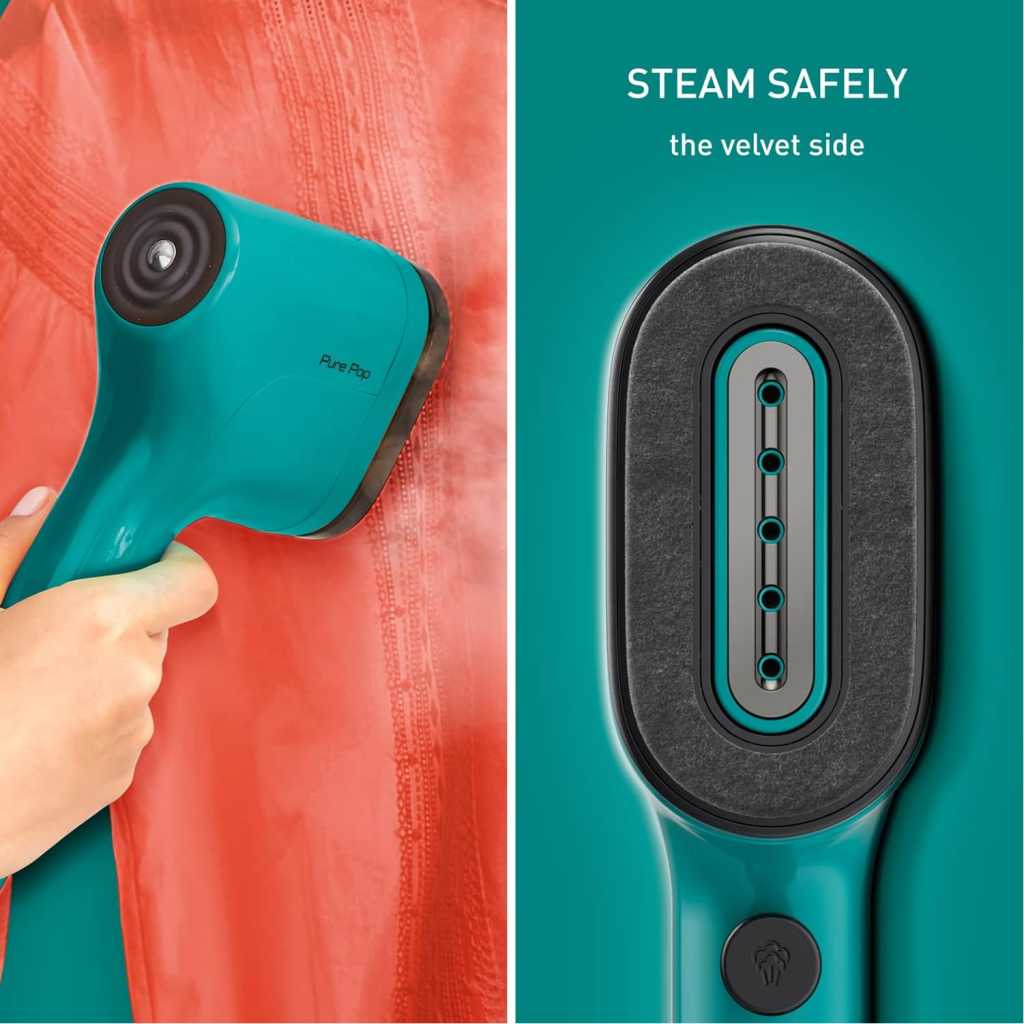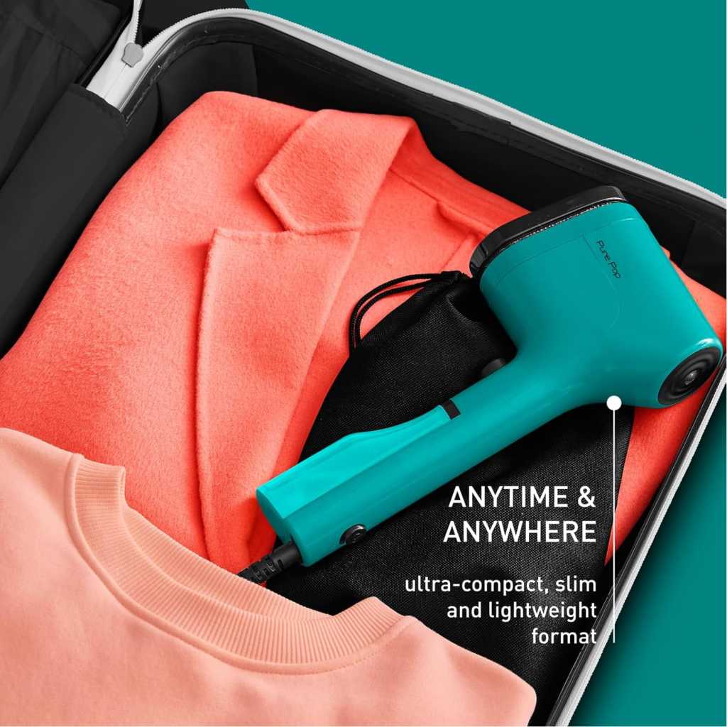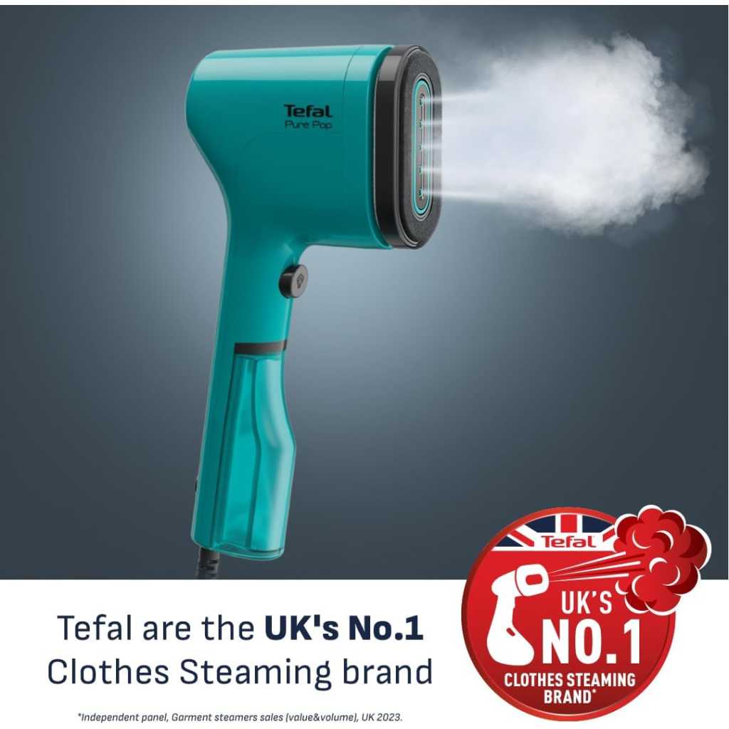 Key Features: WORK FAST: Portable but punchy, Tefal Pure Pop heats up in 15 seconds, pumps out 20g of steam a minute, and with a 70ml water tank, it makes creases on one or two items disappear in a flash. Wrinkles? What wrinkles? SWITCH IT UP: Tefal Pure Pop’s clever reversible pad has a velvet side for steaming delicates safely, and a lint removal side that’s great for removing pet hair. Your puppy cuddling secret is safe! STEAM ALL WAYS: Use Tefal Pure Pop vertically or horizontally – no ironing board needed. Use upright to refresh clothes on the hanger. Or lay flat for tough-to-tackle areas, like collars and cuffs TRAVEL LIGHT: Lightweight and ultra-slim, Tefal Pure Pop is made for travel. It even has its own pouch! Pop this little steamer in your suitcase and look your best on the go! COLOUR ME STYLISH: Say goodbye to creases and hello to style with Tefal Pure Pop. With its Teal Green hue and unique slim silhouette, this standout clothes steamer looks sharp – and it’ll make sure you do, too!