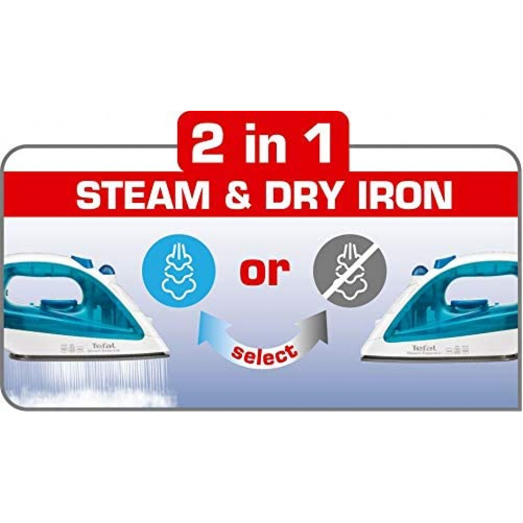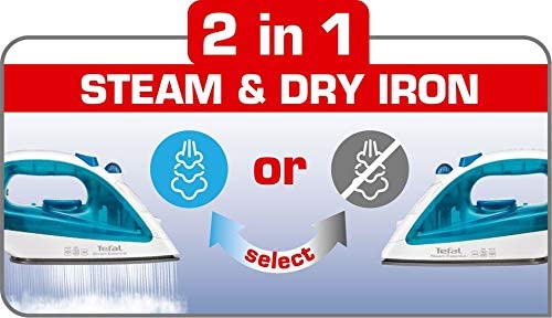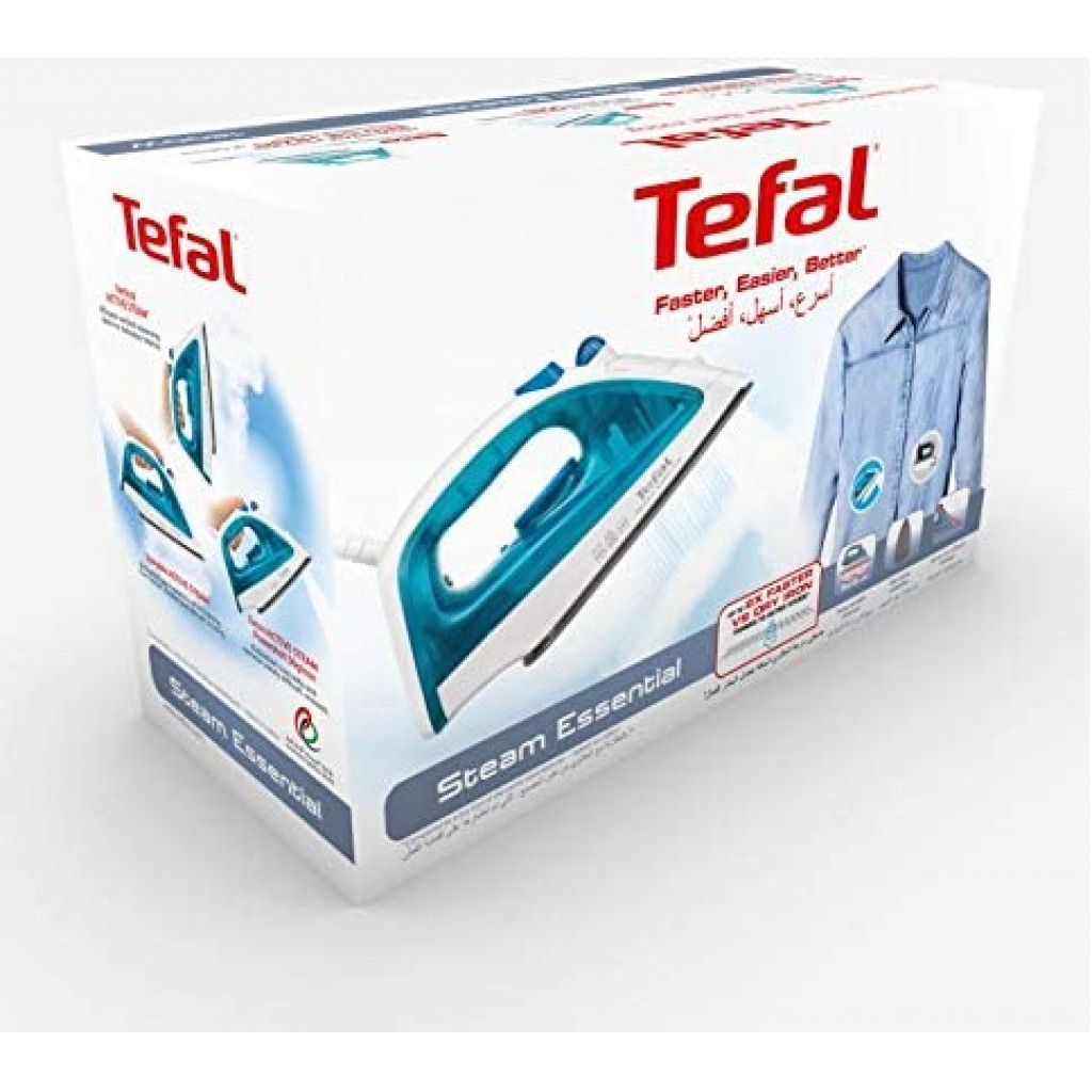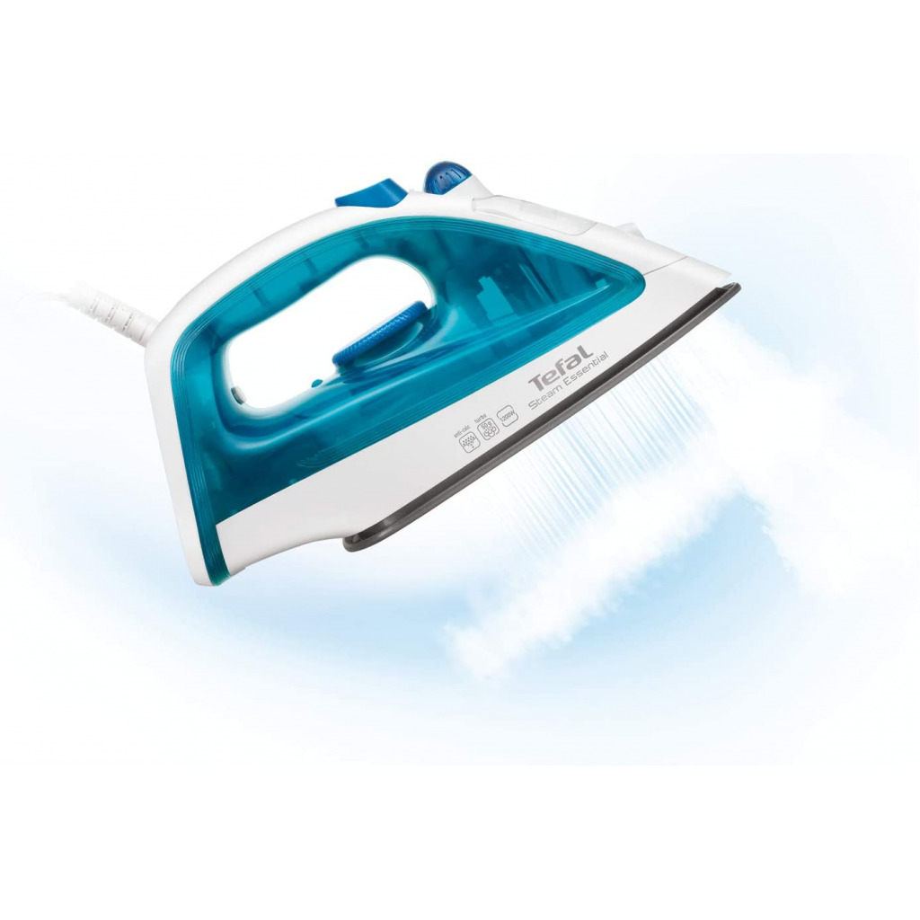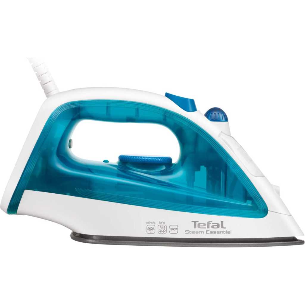 TEFAL Steam Essential Steam Iron, 150 ml, 1200 Watts, Blue / White, Plastic, FV1026M0 Tefal steam iron fv1026m0 1200w non-stick soleplate 50 g steam boost 2in1 steam and dry iron Key Features: TEFAL Steam Essential Steam Iron, 150 ml, 1200 Watts, Blue / White, Plastic, FV1026M0 Continuous steam: to humidify and soften the fabric fibers with shot of steam: 50g/min, sends a powerful steam output to remove efficiently and easily tough creases Vertical steam, very convenient to iron delicate garments Easy and fast ironing and easy to handle, light weight design with 150ml watertank A non stick soleplate for effortless glide on the fabric Spray to remove instantly very tough creases