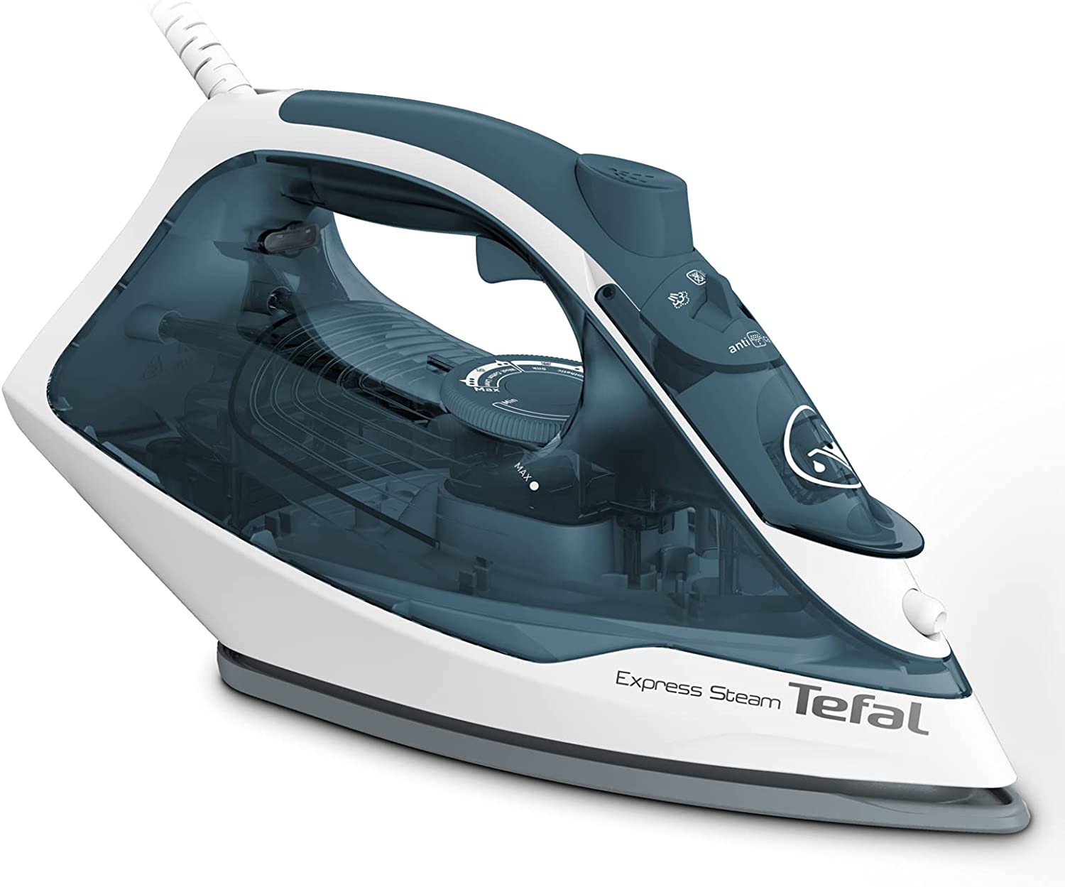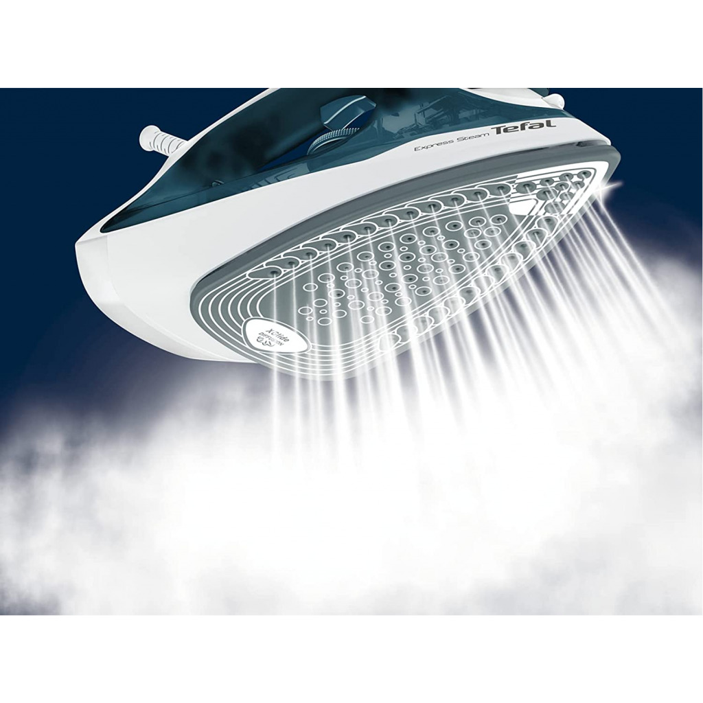 Tefal Express Steam 270ml Steam Iron, 2400 Watts, Blue/White, Cerilium/Plastic, Fv2831M0 Bringing together higher steam performance* and enhanced features, EXPRESS STEAM makes ironing fast and easy. EXPRESS STEAM is equipped with a true ceramic soleplate for long lasting performance. The iron also comes with 1600W of power for a quick heat-up time, an extra-powerful 210 g/minute steam boost to tackle even the most stubborn creases. Discover an iron that matches performance with enhanced features: the anti-drip feature keeps fabric spotless and protected, and a large water tank easy to refill. Key Features: Tefal Express Steam 270ml Steam Iron, 2400 Watts, Blue/White, Cerilium/Plastic, Fv2831M0 POWERFUL: 2400W of power for fast heat-up and efficient ironing FAST: A steam iron equipped with a true ceramic soleplate for fast glide REMOVE CREASES: Up to 210 g/min steam boost for tough creases and wrinkles EASY TO USE: A large and easy-to-refill water tank, and a spray button to humidify your linen if necessary ANTI-DRIP PROTECTION: The anti-drip system will prevent water from staining your linens