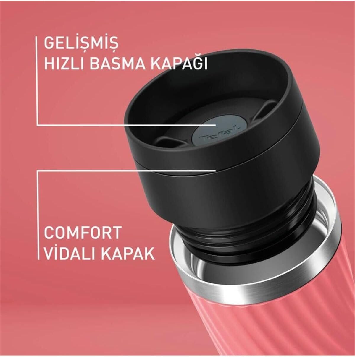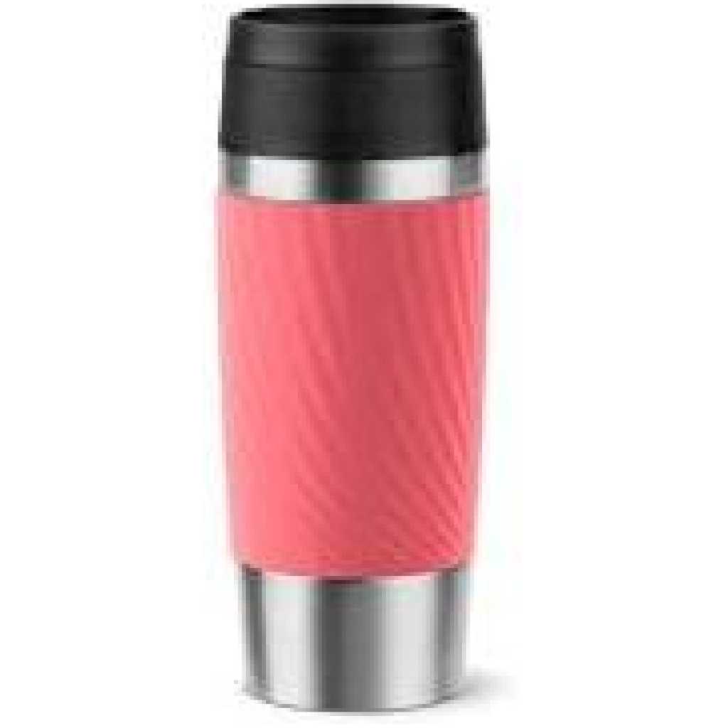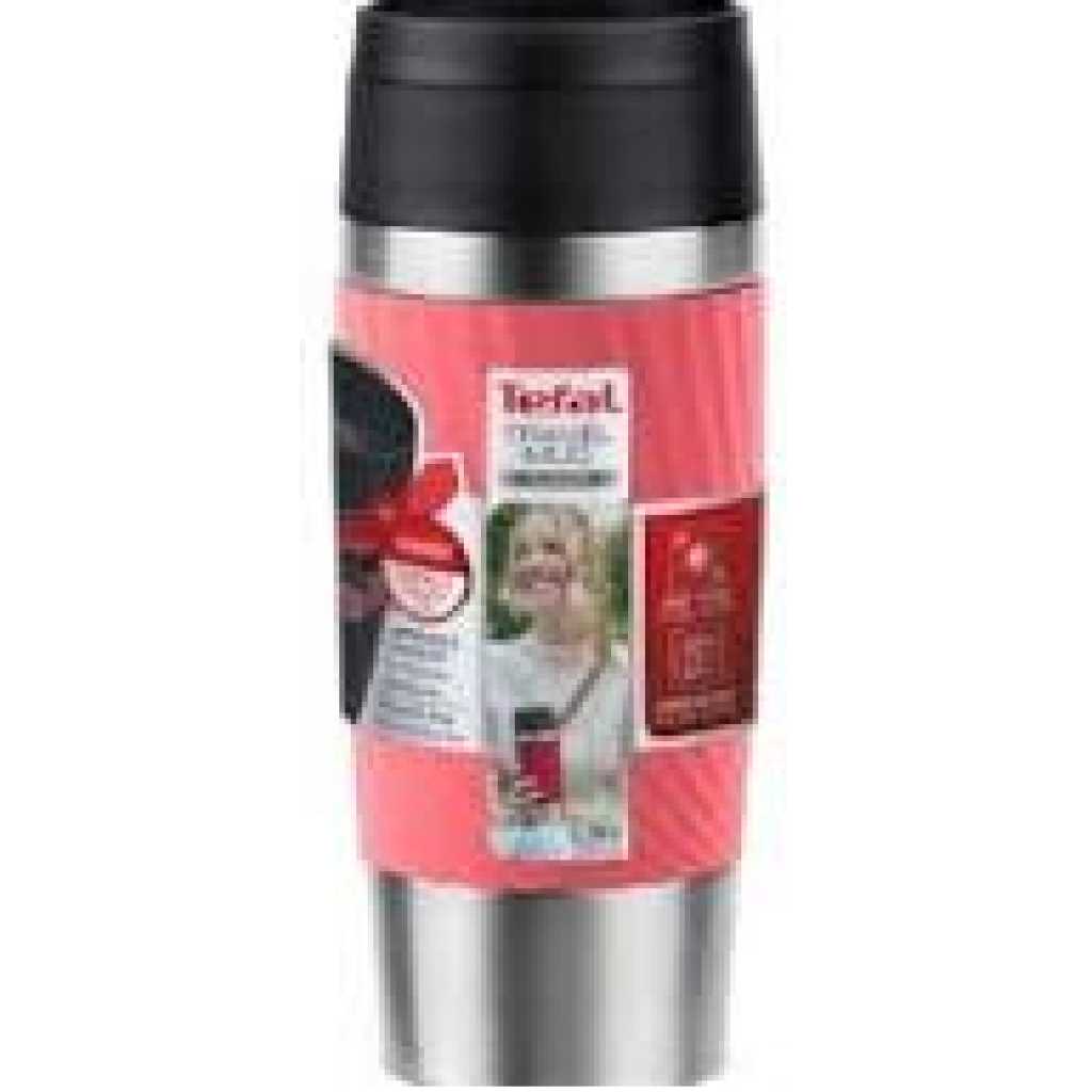 Key Features: TEFAL Thermal Bottle Travel Mug Twist-Coral, Comfort Screw Lid, Quick Press Drinkware, Soft-Touch Sleeve, Travel-Ready, Reusable, 100% Leak-Proof, Keeps Drinks Cold (8 hrs) and Hot (4 hrs), 360° Drinking, N2024410 Brand Tefal Capacity 0.36 litres Colour Pink Recommended uses for product Travel Special feature 100% LEAK-PROOF, EASY TO CLEAN, 360° DRINKING,, Dishwasher Safe